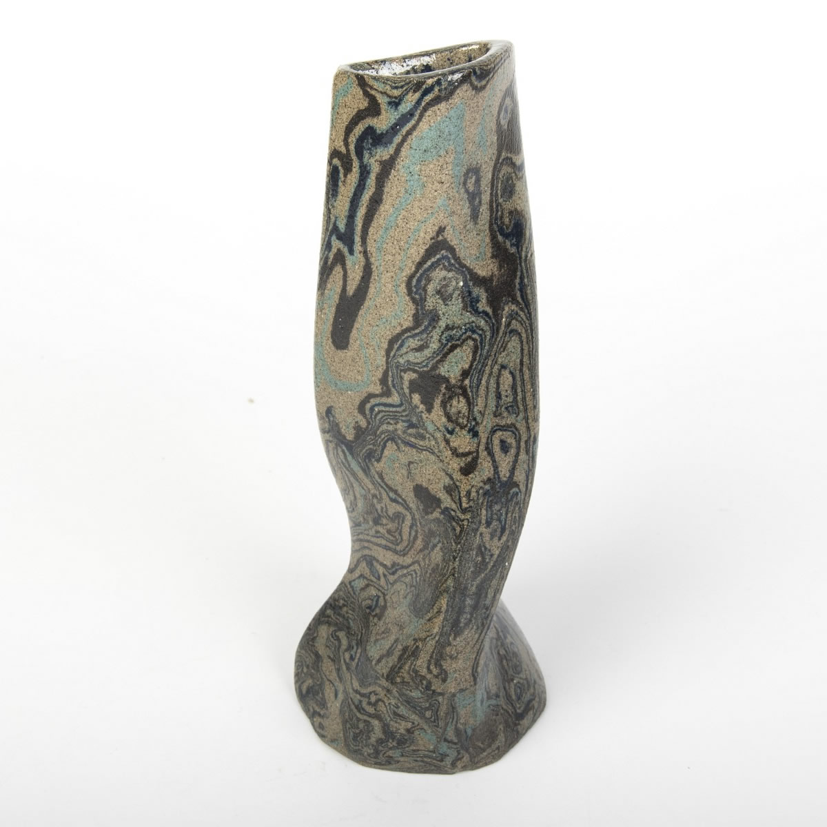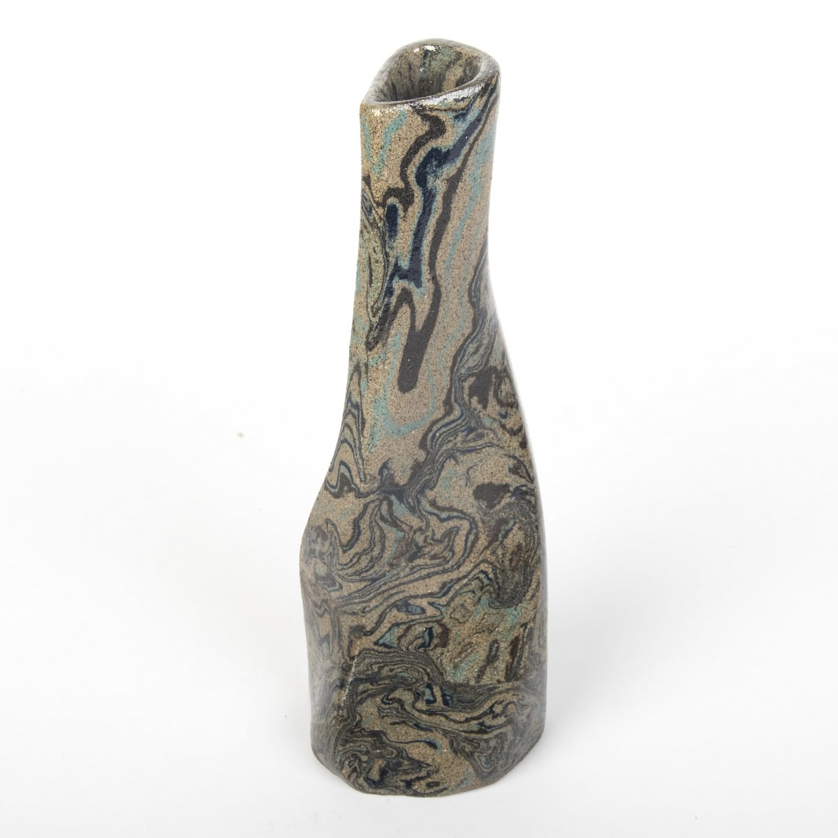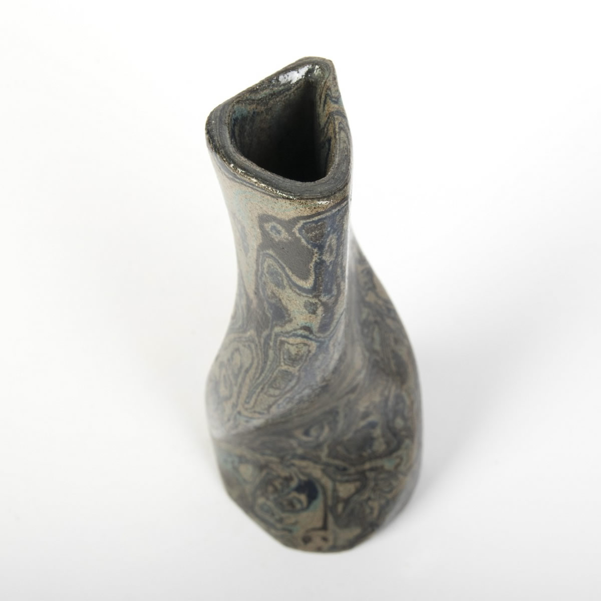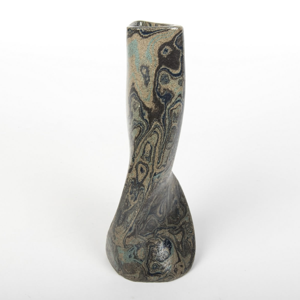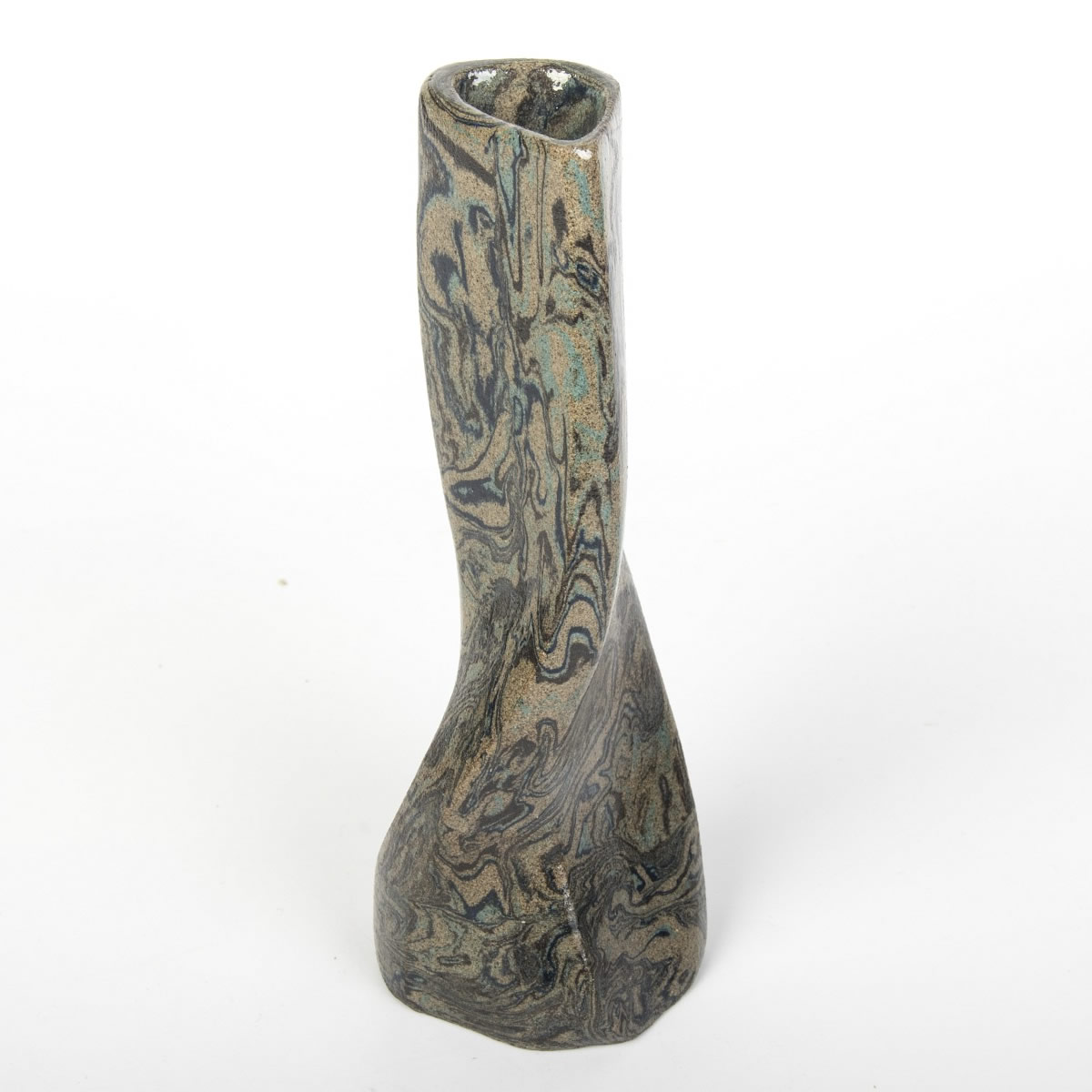 Wazon o niekonwencjonalnej formie, wykonany ręcznie przy użyciu techniki agatowej (marmurkowej, Nerikomi), powstał dzięki starannemu połączeniu kolorowych glin, co zaowocowało stworzeniem wyjątkowego wzoru marmurkowego. Zarówno zewnętrzna, jak i wewnętrzna część wazonu zostały pokryte błyszczącym, przezroczystym szkliwem.