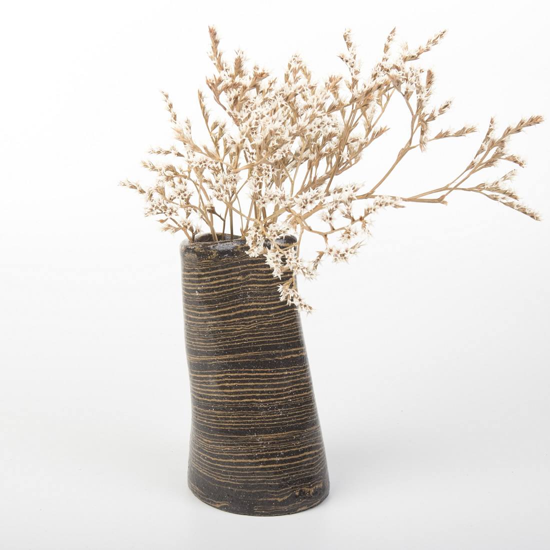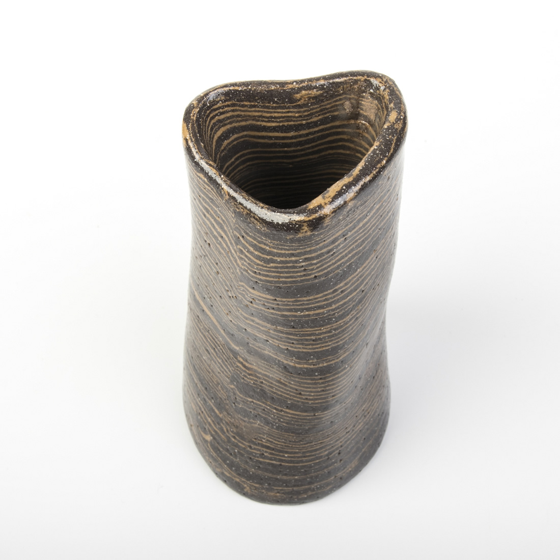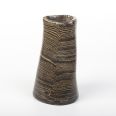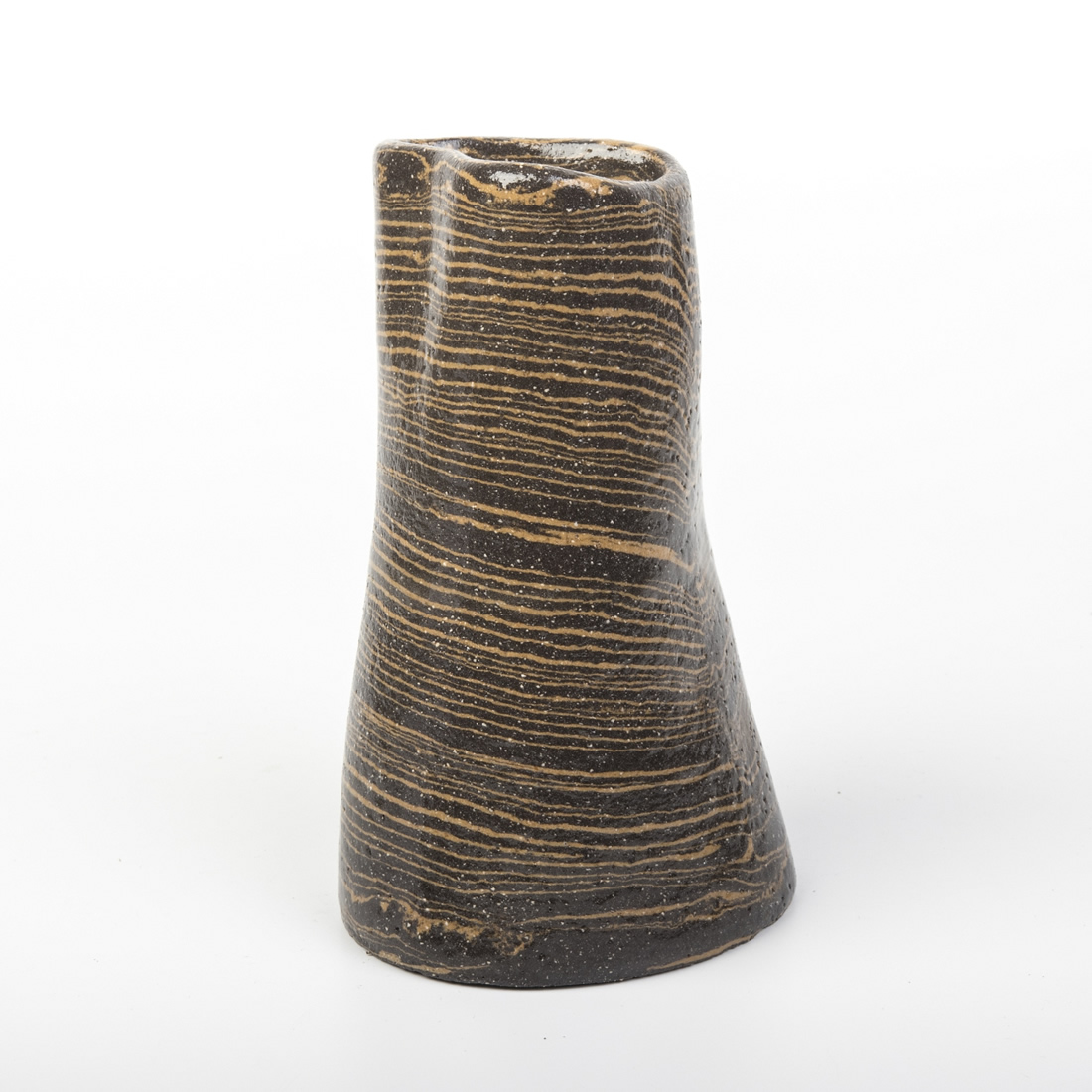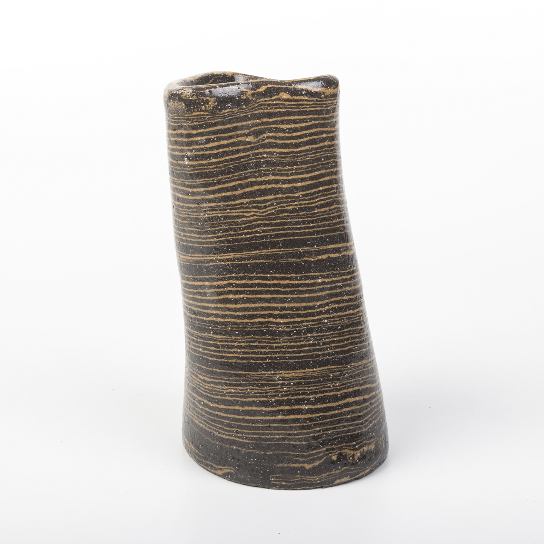 Ręcznie formowany wazon wykonany techniką Nerikomi, polegająca na odpowiedzim mieszaniu kolorowych glin. W przypadku tego przedmiotu - zmieszana została czarna glina z pomarańczową. Kolor pomarańczowy uzyskany został dzięki zmieszaniu białej gliny z pomarańczowym pigmentem.