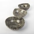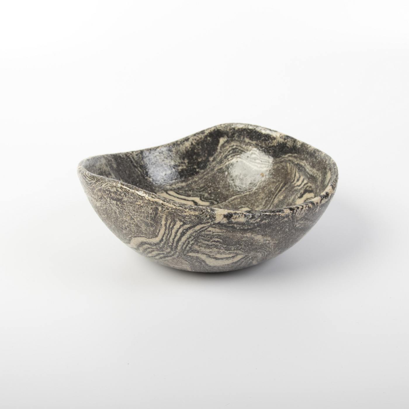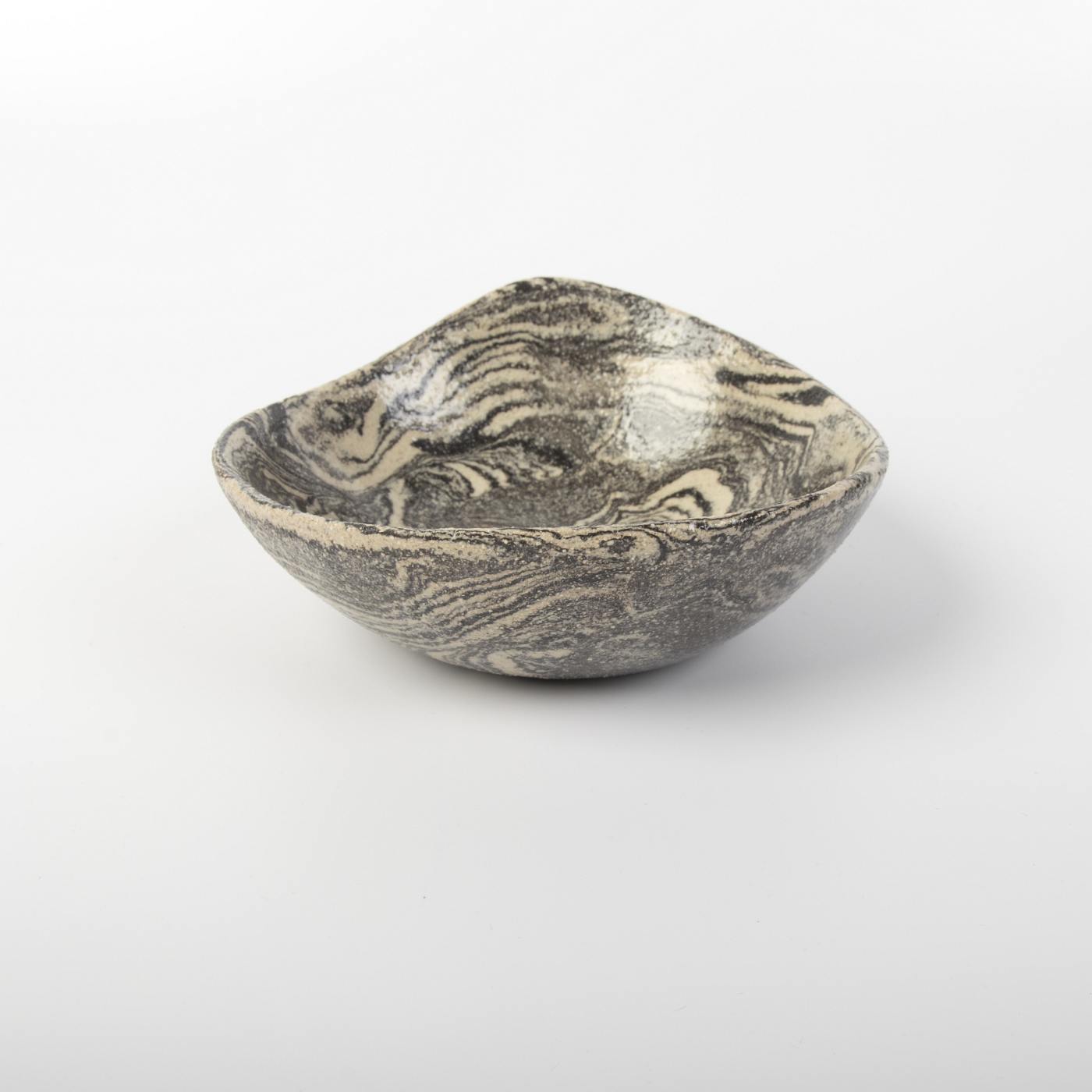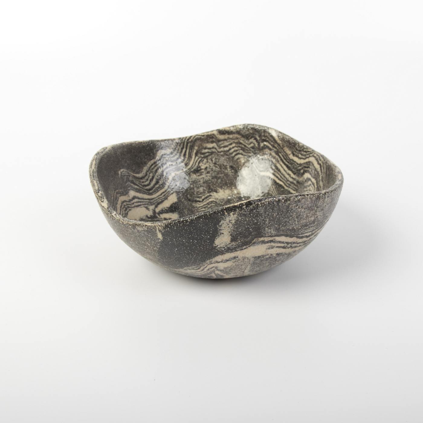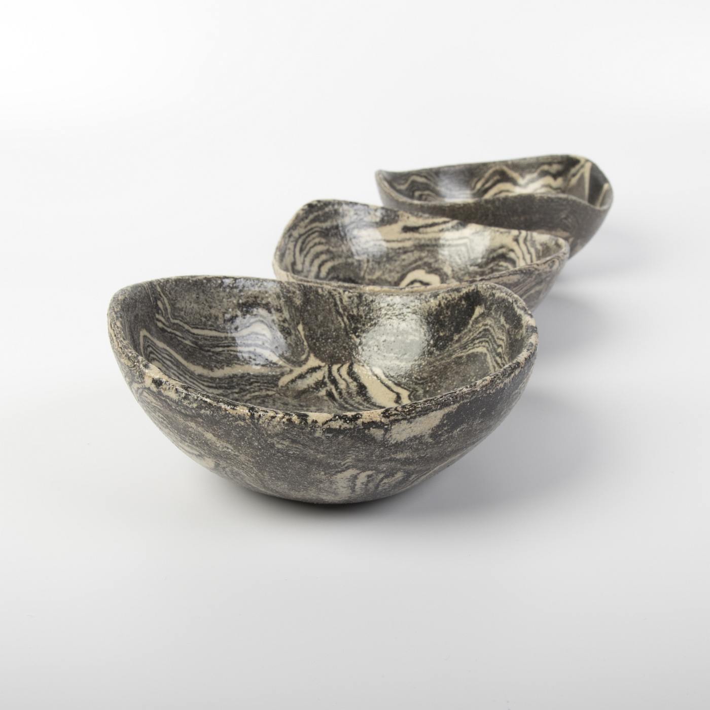 Elegancki zestaw trzech ręcznie wykonanych misek ceramicznych w klasycznych odcieniach czerni i kremu. Każda miska charakteryzuje się unikalnym wzorem, który powstał dzięki precyzyjnemu połączeniu barwionych mas ceramicznych, co podkreśla indywidualny charakter każdego naczynia.