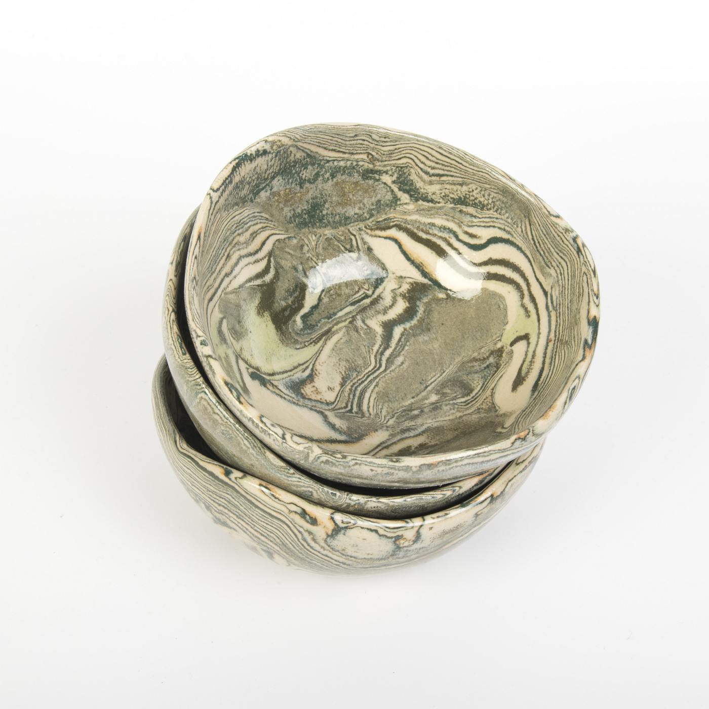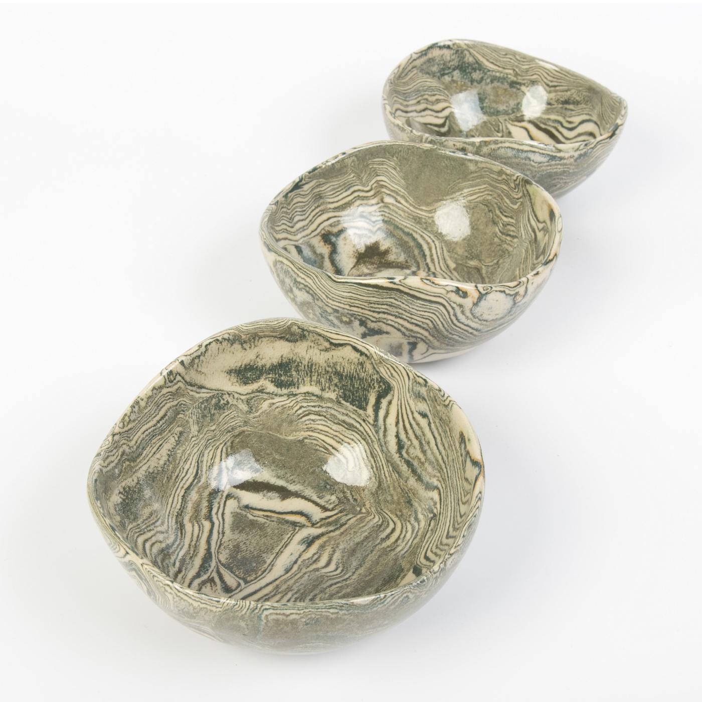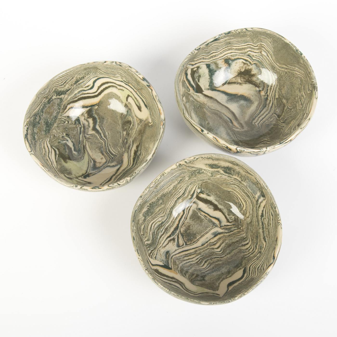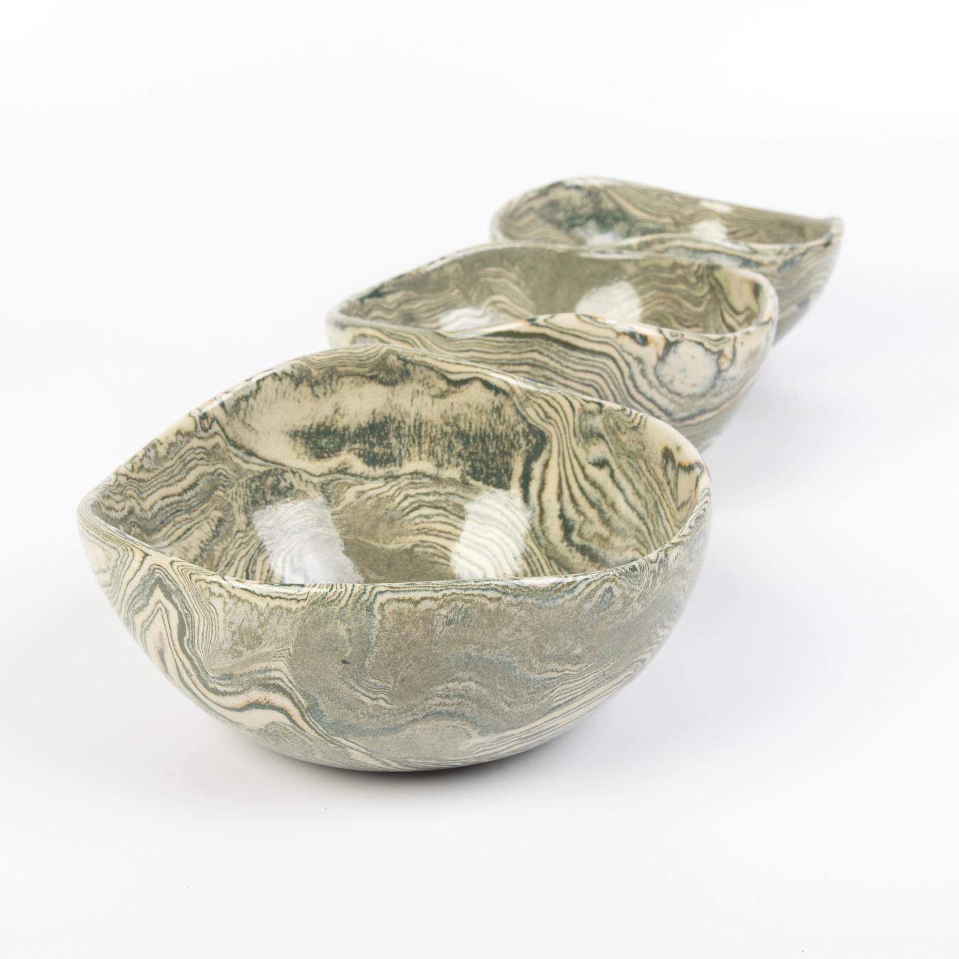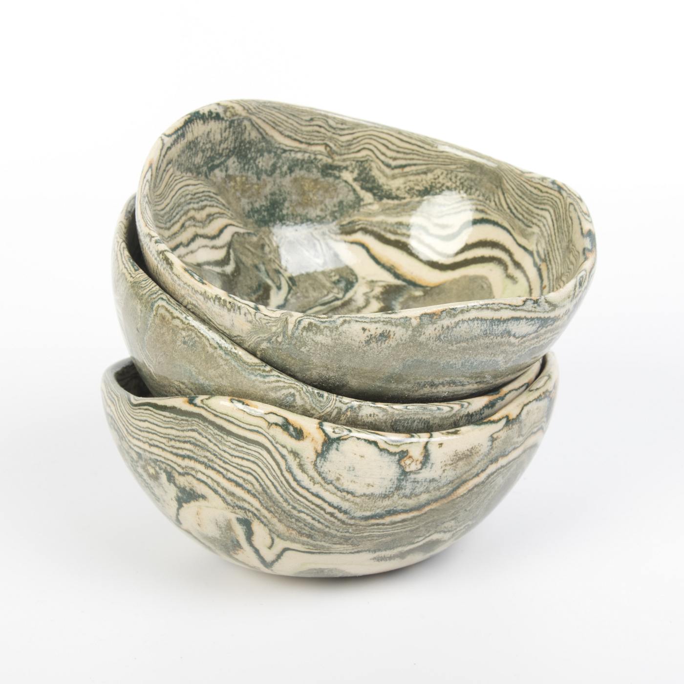 Zestaw trzech ręcznie wykonanych misek ceramicznych o gładkiej, błyszczącej powierzchni w harmonijnych odcieniach zieleni. Miski zostały stworzone z niezwykłą precyzją, a każda z nich jest unikalna dzięki procesowi ręcznego formowania i wykończenia.