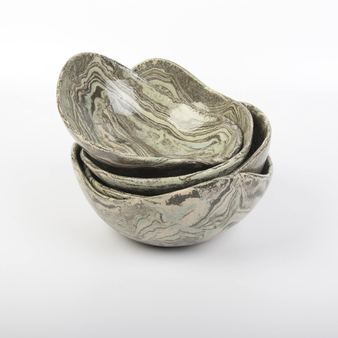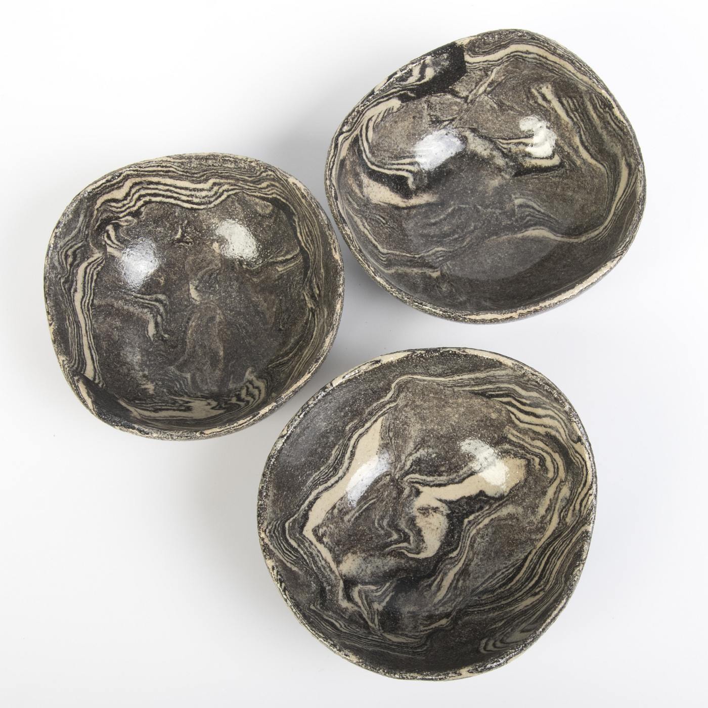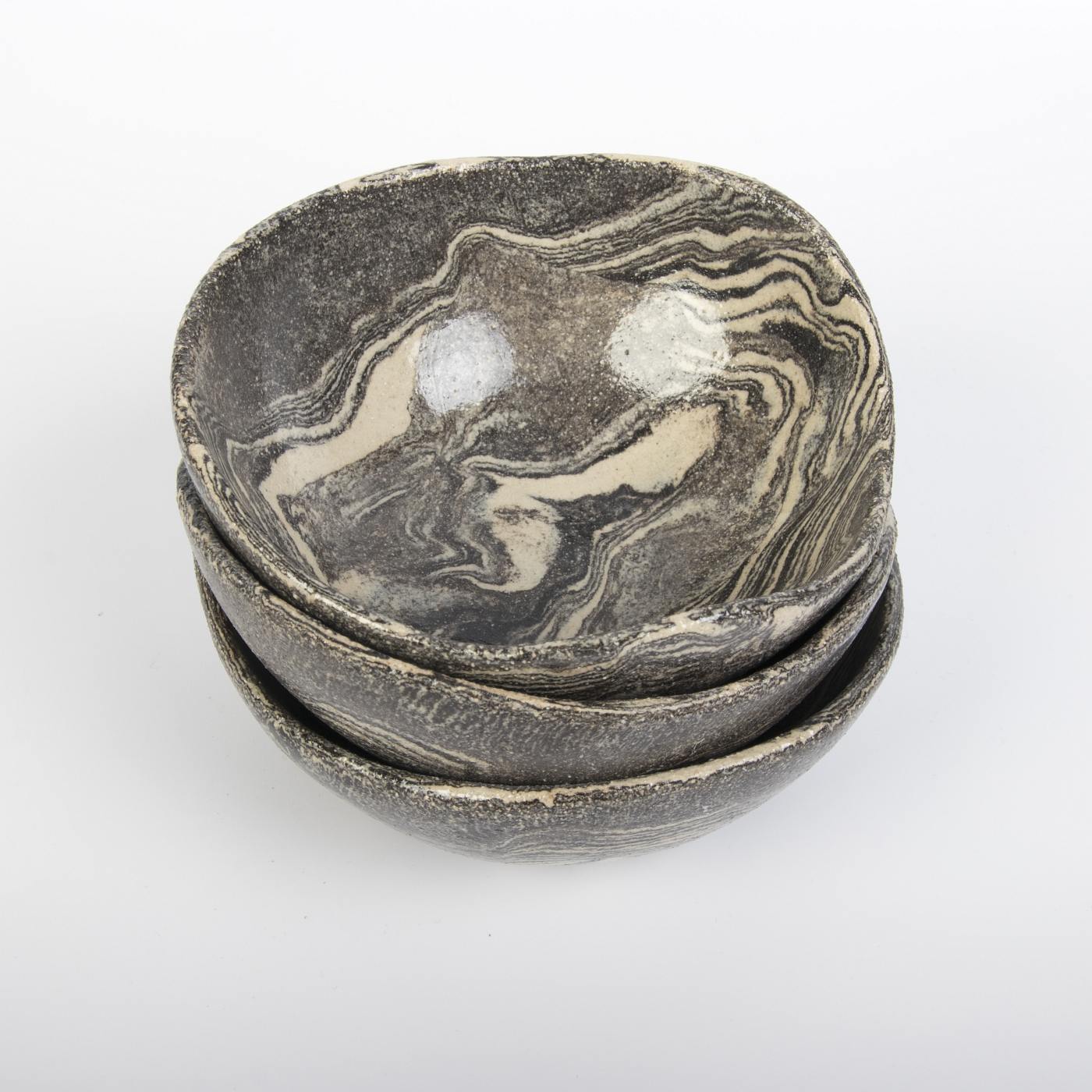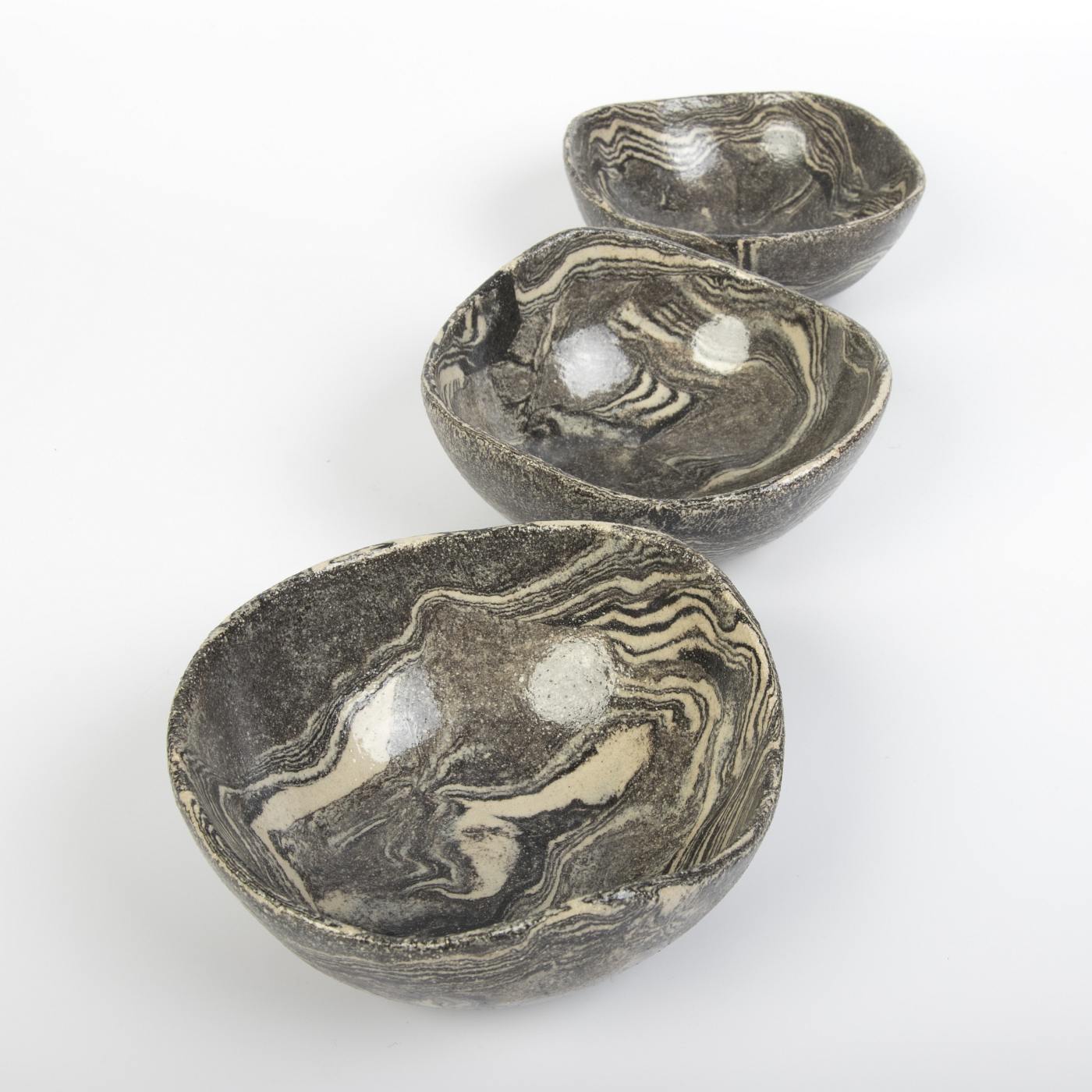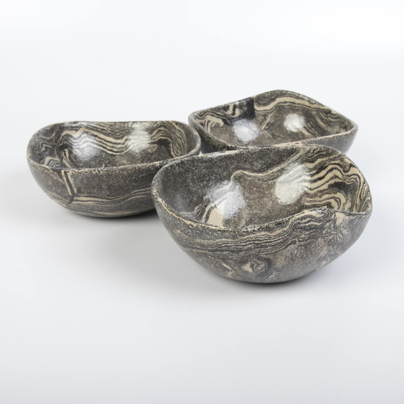 Ten wyjątkowy zestaw trzech misek ceramicznych łączy w sobie elegancję kremowo-czarnej kolorystyki z unikalnym, lekko chropowatym wykończeniem powierzchni. Każda miska została starannie uformowana ręcznie, co nadaje im niepowtarzalny charakter i podkreśla kunszt rzemieślniczy. Technika NERIKOMI, zastosowana podczas tworzenia, polega na łączeniu barwionych mas ceramicznych, co skutkuje subtelnym, marmurkowym wzorem, czyniąc każdą misę unikalnym dziełem sztuki.