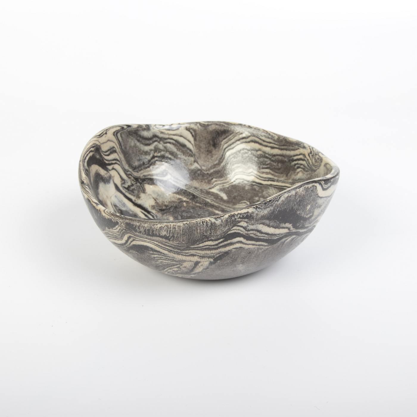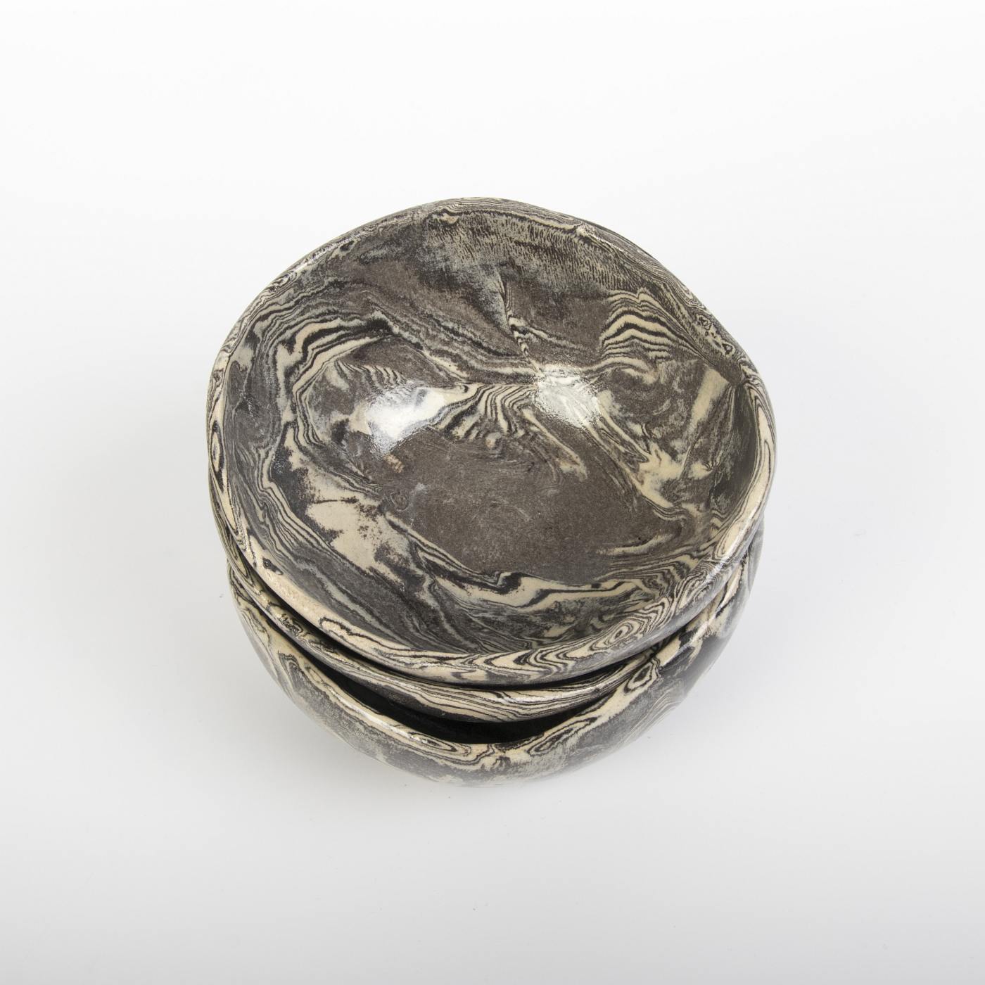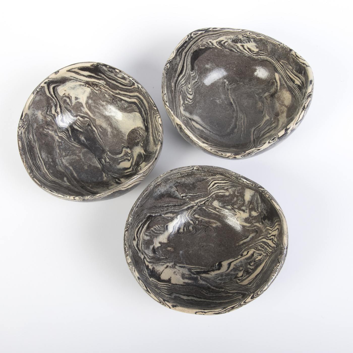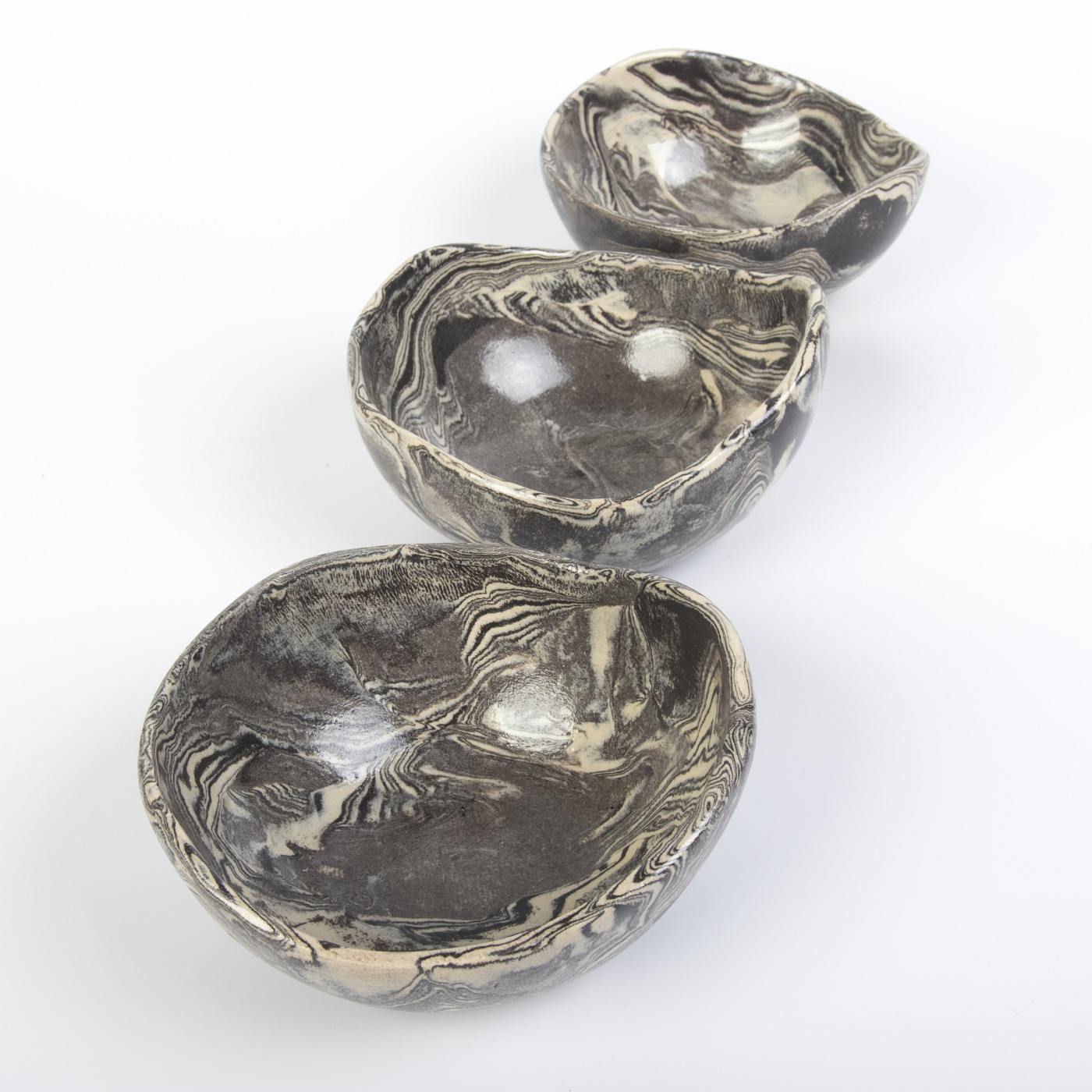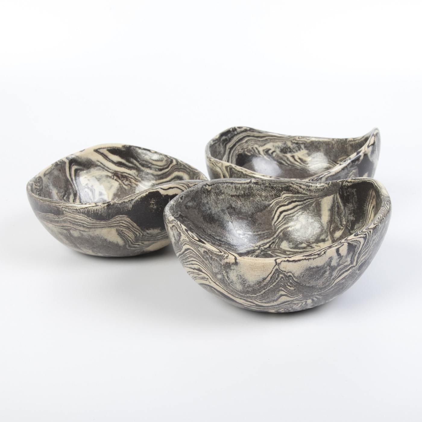 Unikalny zestaw trzech misek ceramicznych w eleganckich odcieniach kremu i czerni, ozdobionych subtelnym marmurkowym wzorem. Każda miska została starannie uformowana ręcznie, co podkreśla niepowtarzalny charakter i kunszt rzemieślniczy. Technika NERIKOMI, zastosowana podczas tworzenia, zapewnia organiczne i jedyne w swoim rodzaju wzory, inspirowane naturą.