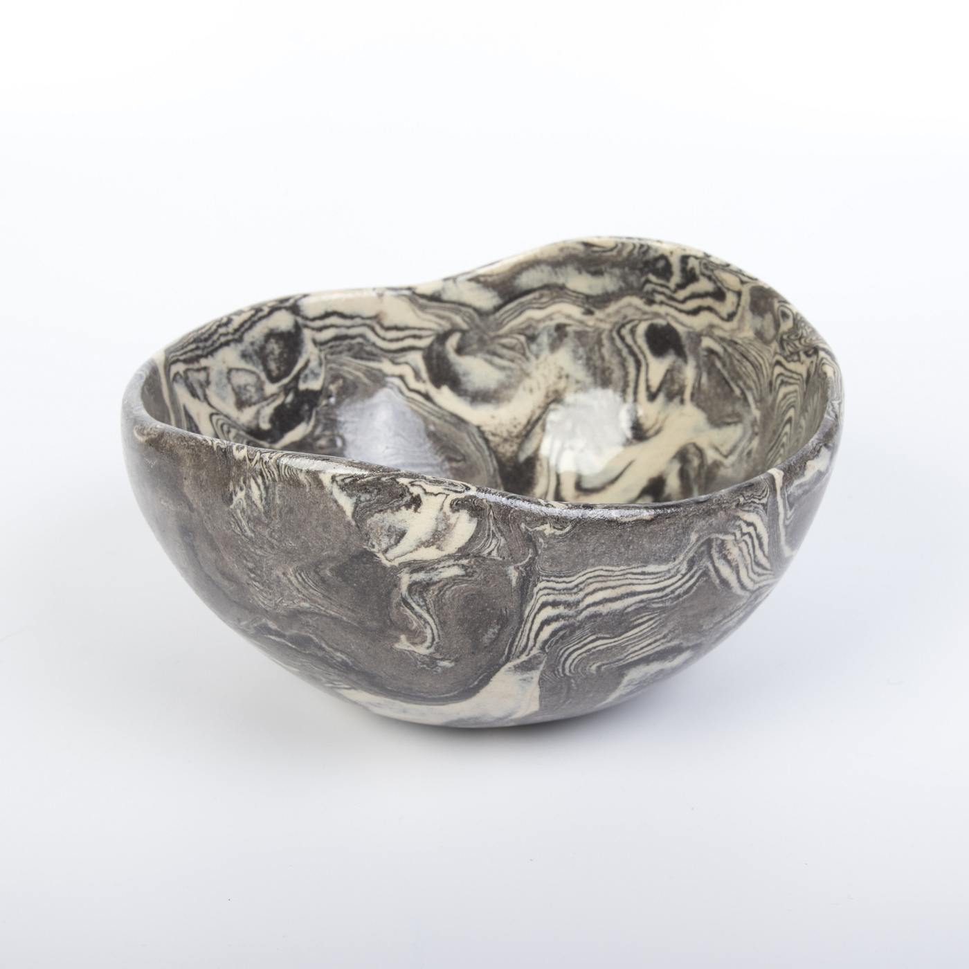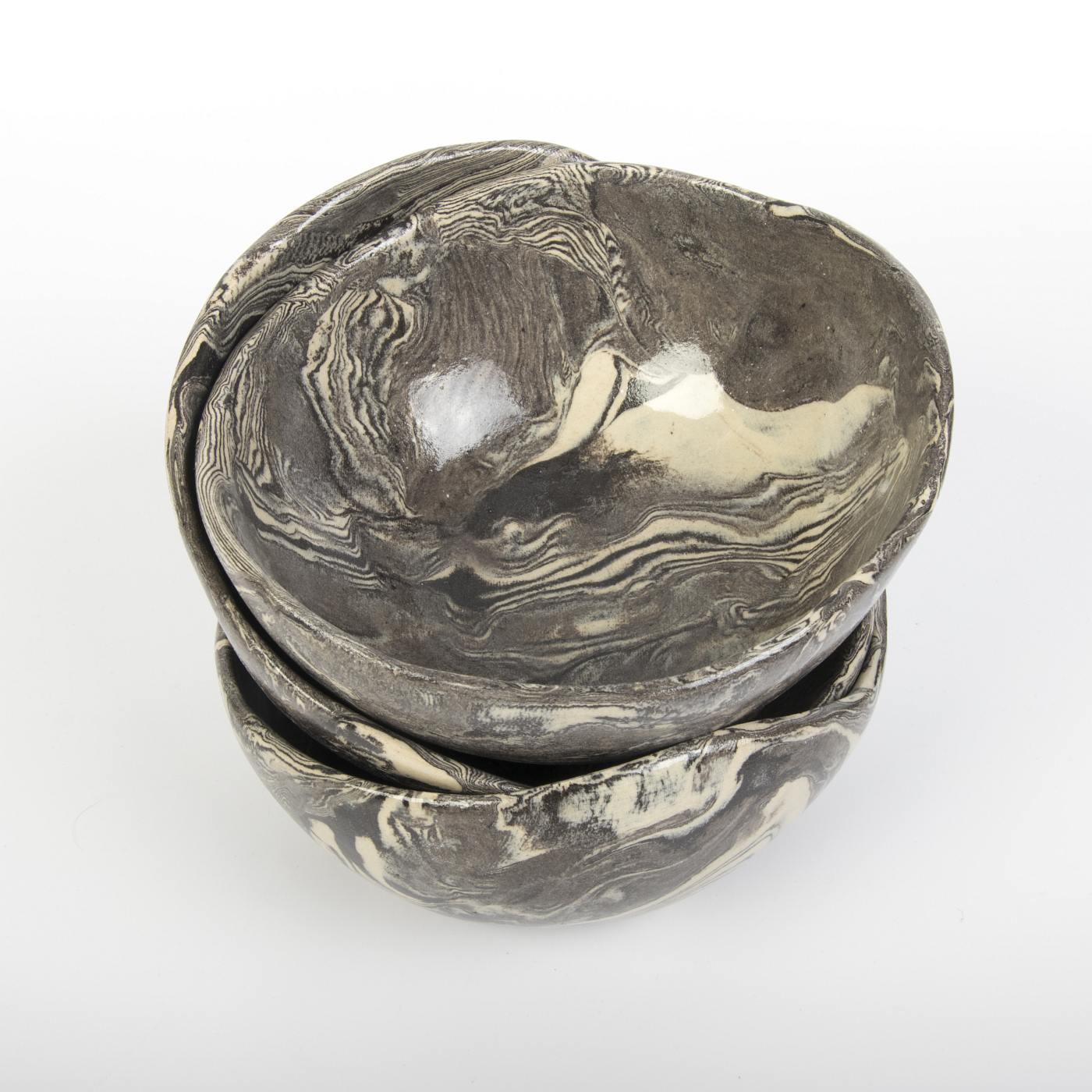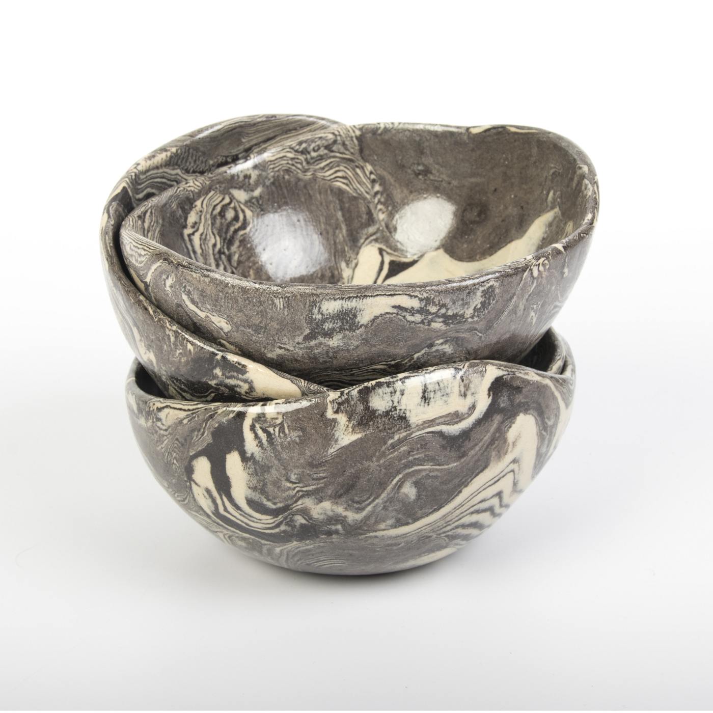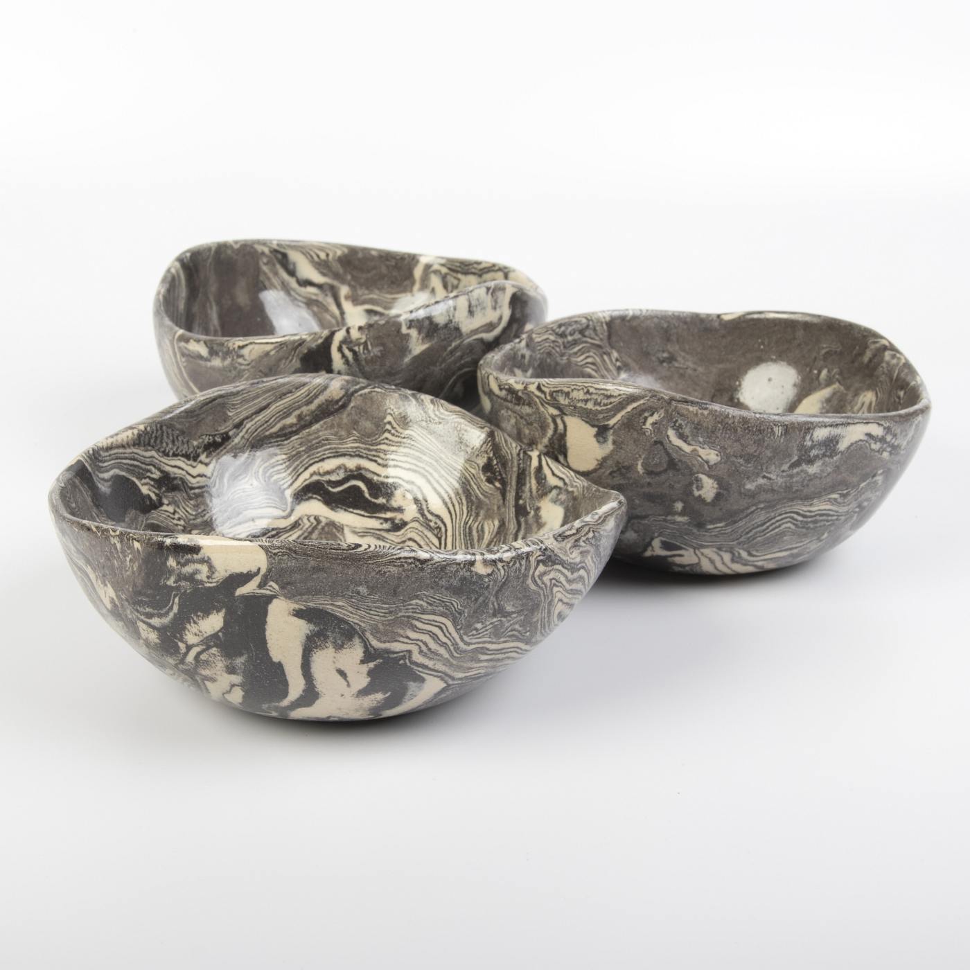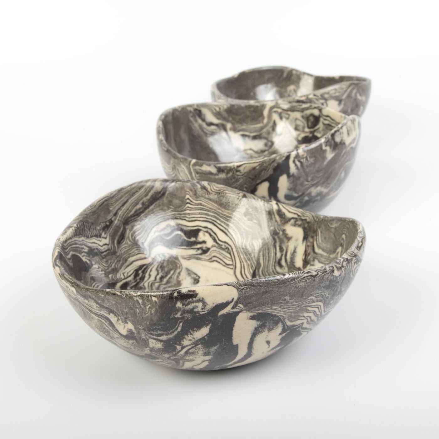 Stylowy zestaw trzech ręcznie wykonanych misek ceramicznych, ozdobionych marmurkowym wzorem w eleganckich odcieniach kremu i czerni. Technika NERIKOMI, zastosowana podczas tworzenia, nadaje każdej misce unikalny, organiczny wzór, dzięki czemu każda z nich jest jedyna w swoim rodzaju.