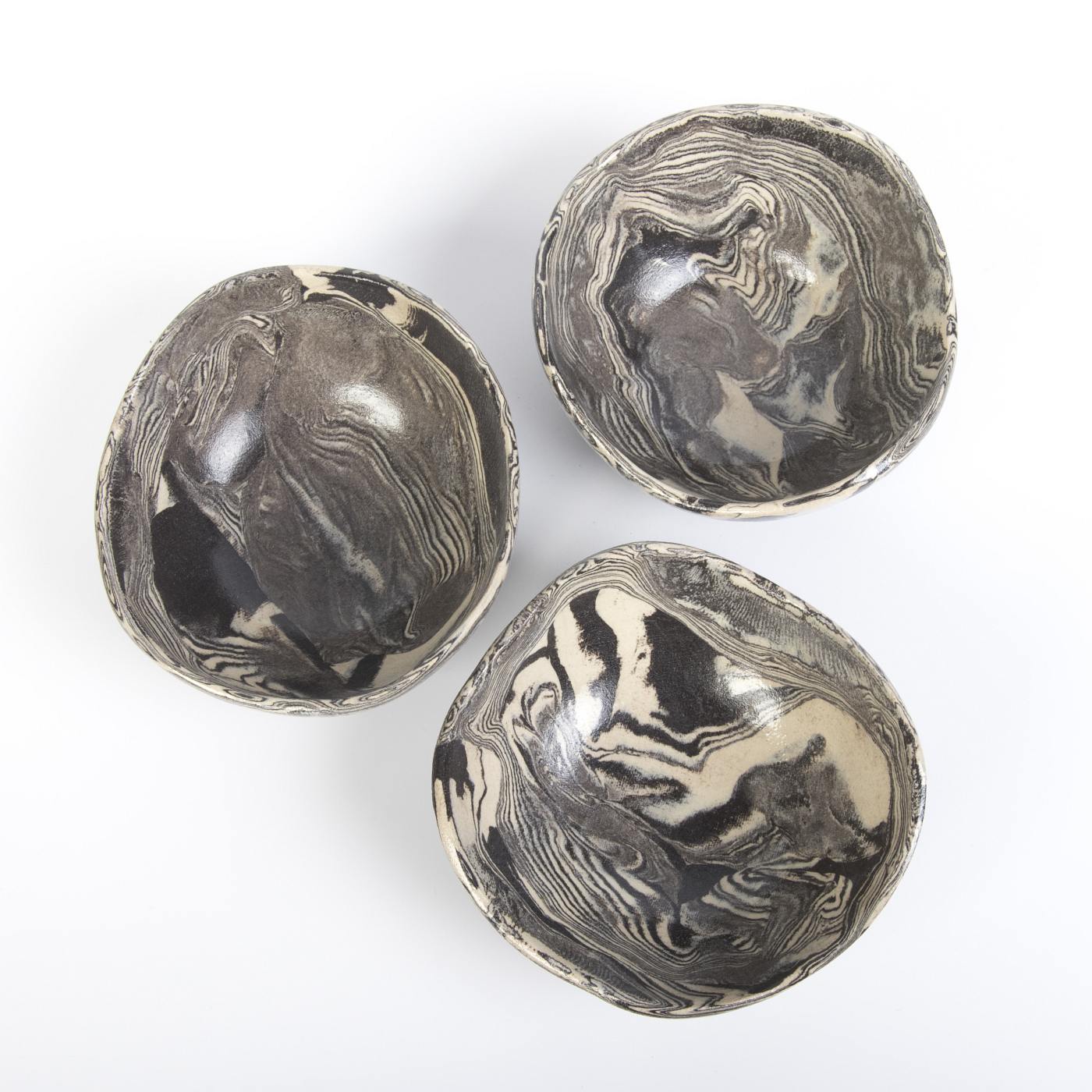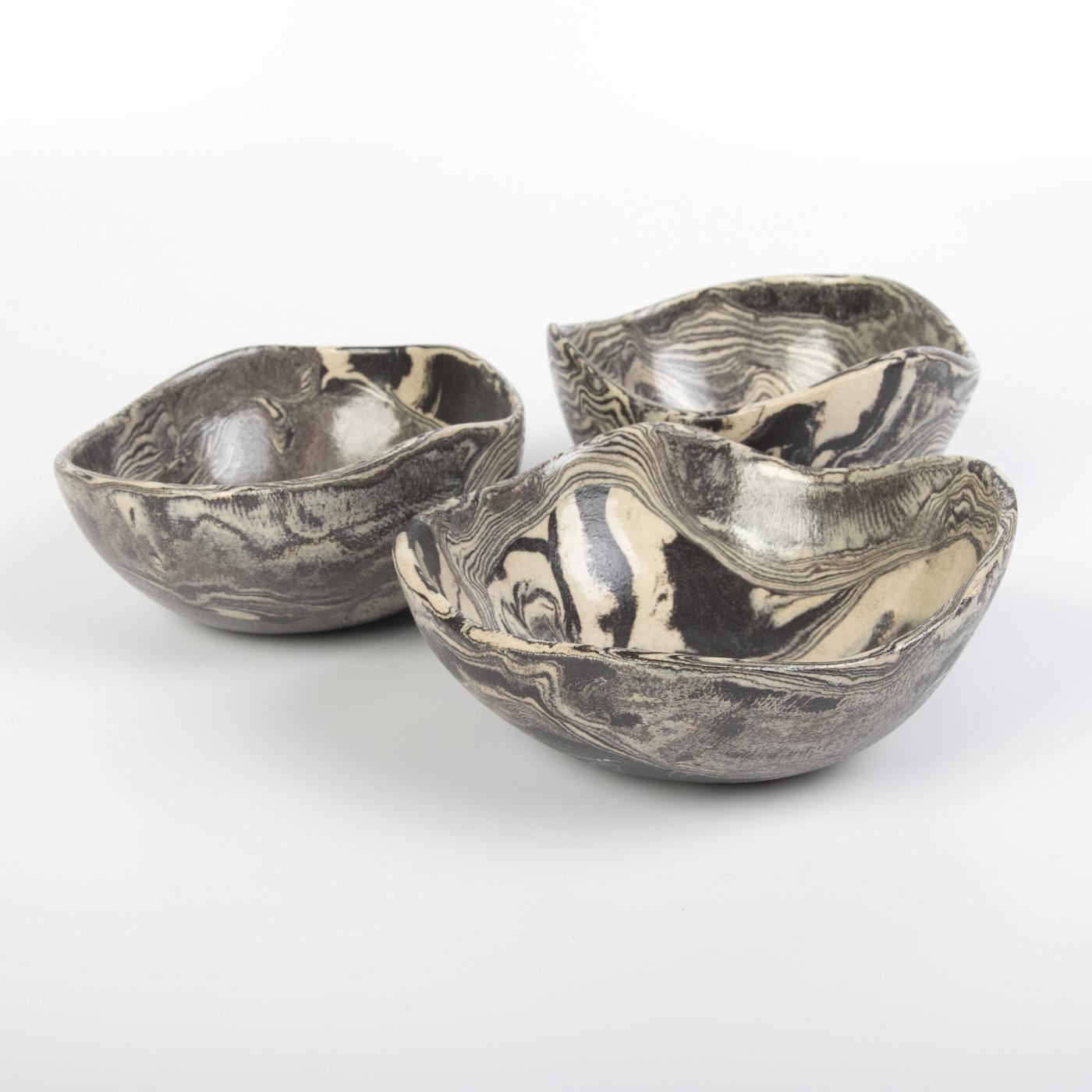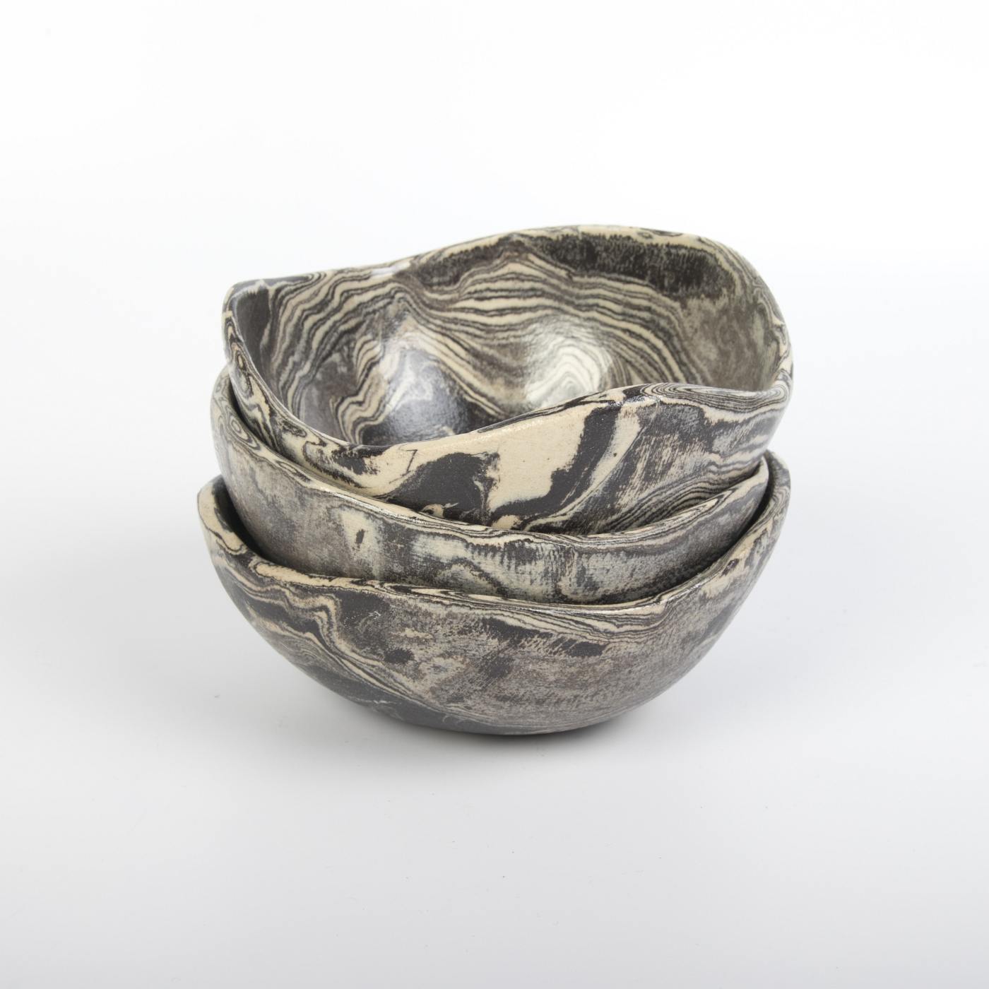 Elegancki zestaw trzech misek ceramicznych o średnicy 11 cm, charakteryzujących się unikalnym marmurkowym wzorem w odcieniach kremu i czerni. Ręczne wykonanie każdej miski gwarantuje ich niepowtarzalność oraz wysoką jakość. Technika NERIKOMI, polegająca na łączeniu barwionych mas ceramicznych, nadaje naczyniom wyjątkowy, organiczny wzór, przypominający naturalne struktury kamienia.