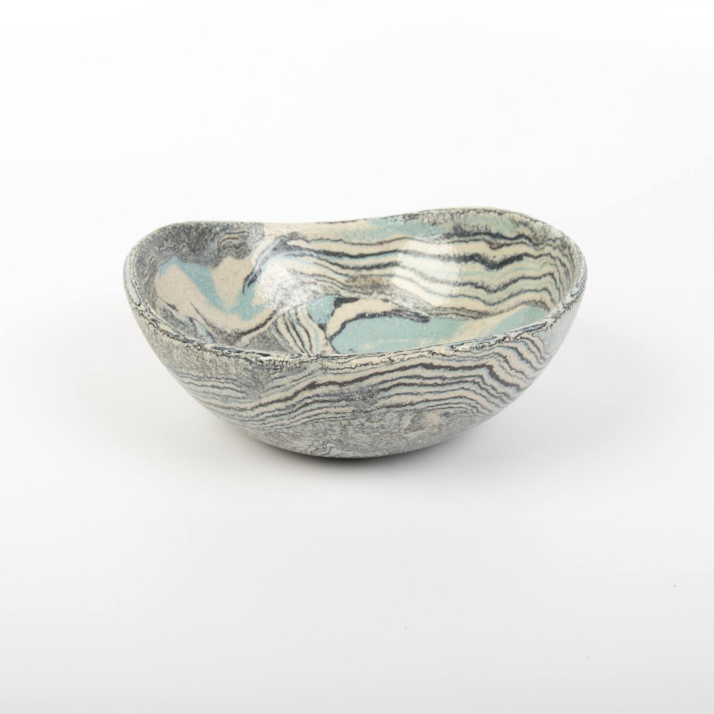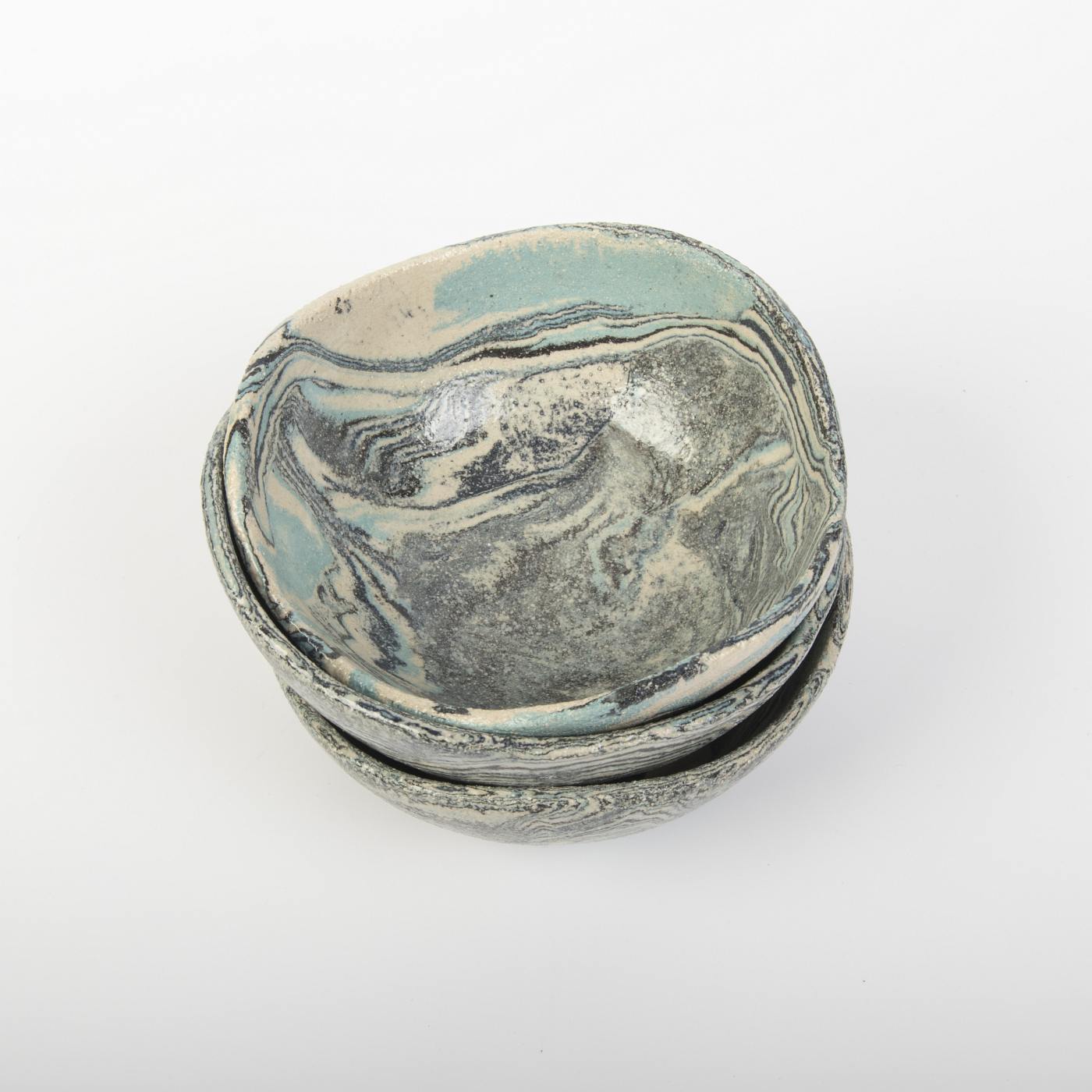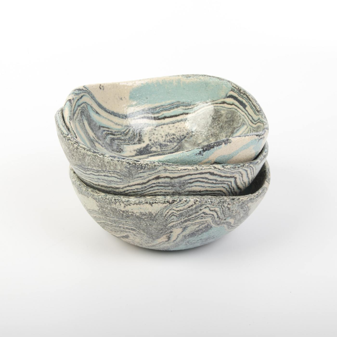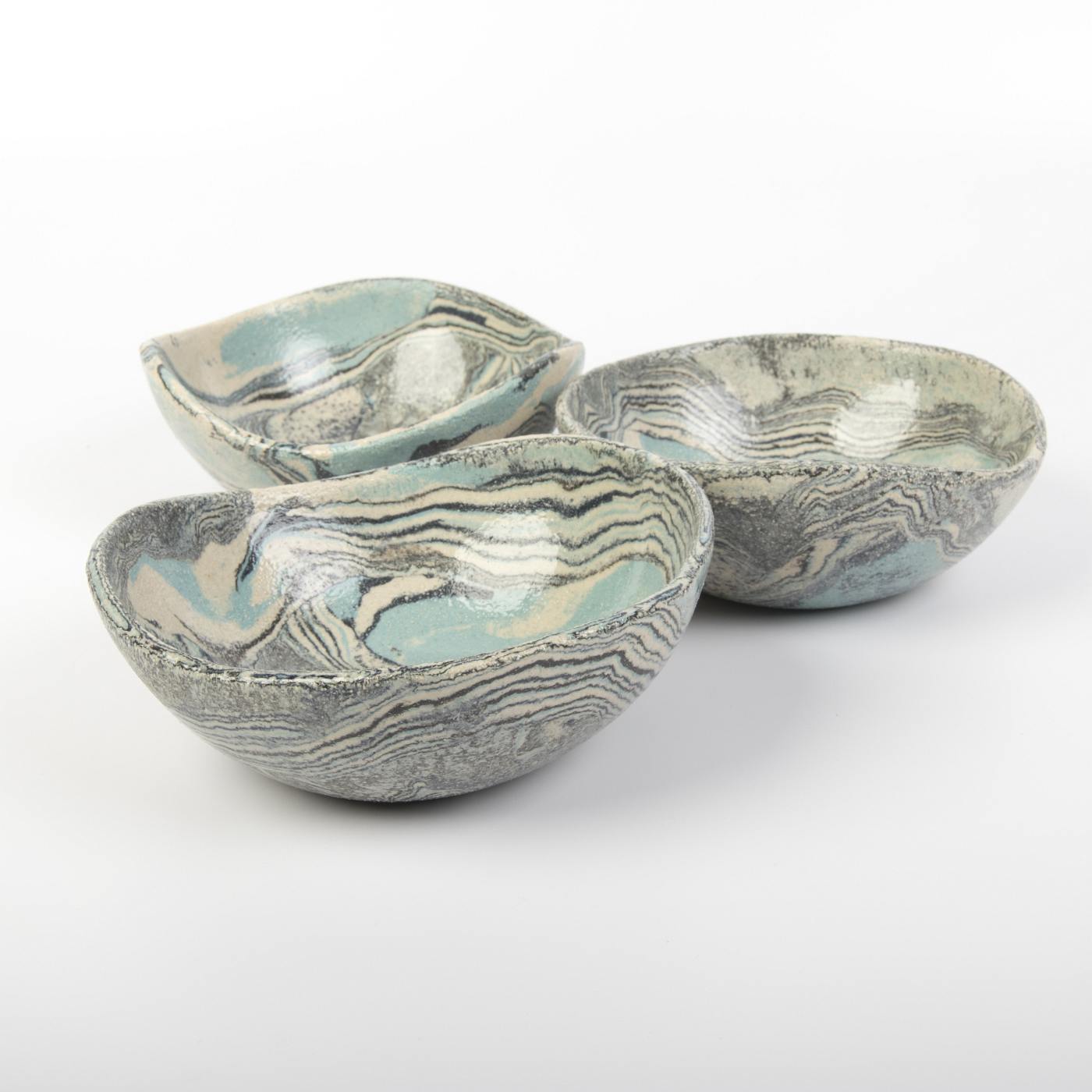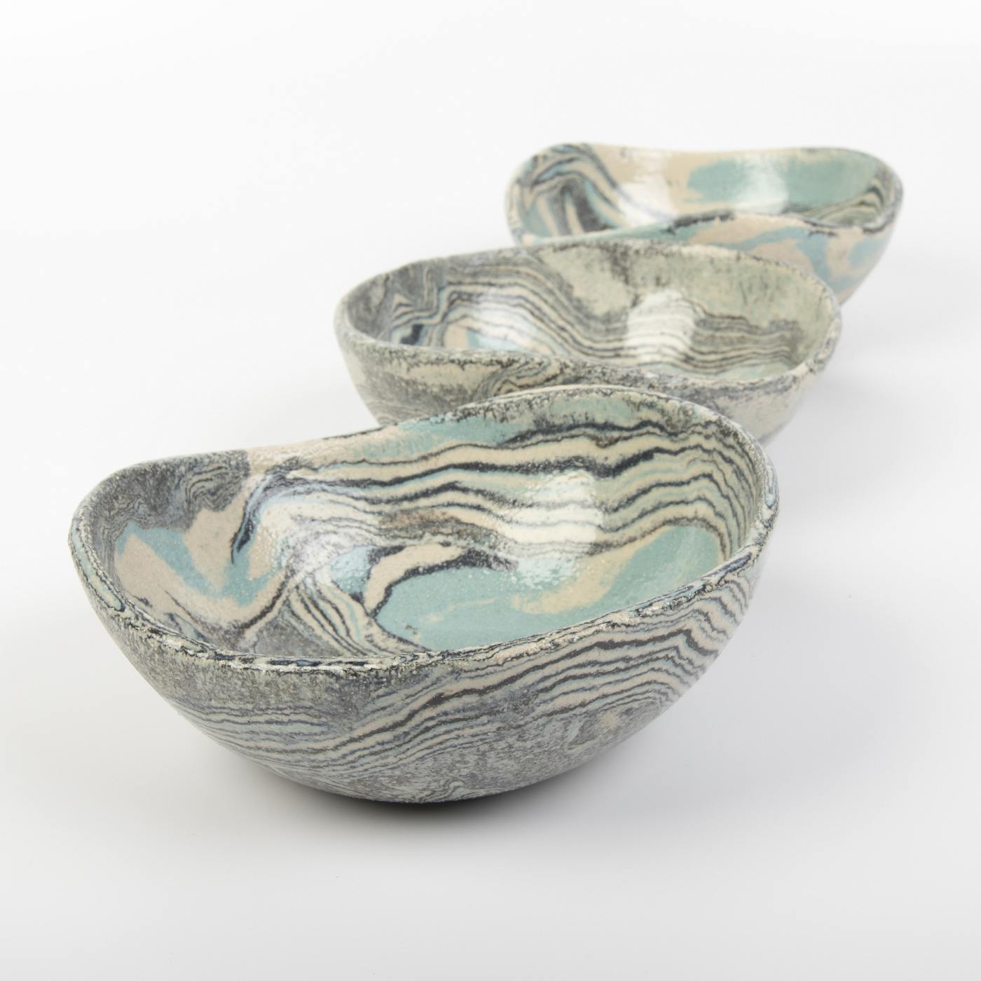 Ten unikalny zestaw trzech małych miseczek ceramicznych został stworzony z wykorzystaniem techniki agatowej (NERIKOMI), która nadaje każdemu naczyniu niepowtarzalny, marmurkowy wzór inspirowany naturalnymi strukturami kamienia. Miseczki zostały ręcznie wykonane z najwyższą precyzją, co czyni je prawdziwym dziełem sztuki użytkowej.