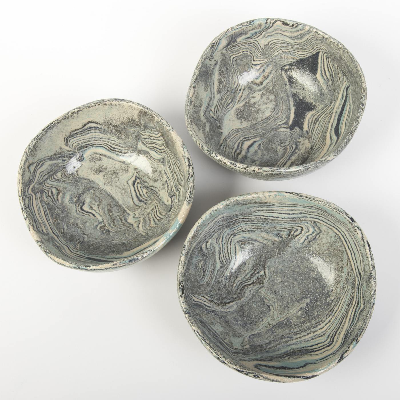 Zestaw trzech małych miseczek ceramicznych, wykonanych z wykorzystaniem techniki agatowej (NERIKOMI), wyróżnia się unikalnym, marmurkowym wzorem, który nadaje każdemu naczyniu wyjątkowy charakter. Ręczne wykonanie sprawia, że każda miseczka jest jedyna w swoim rodzaju i odzwierciedla mistrzostwo rzemiosła.