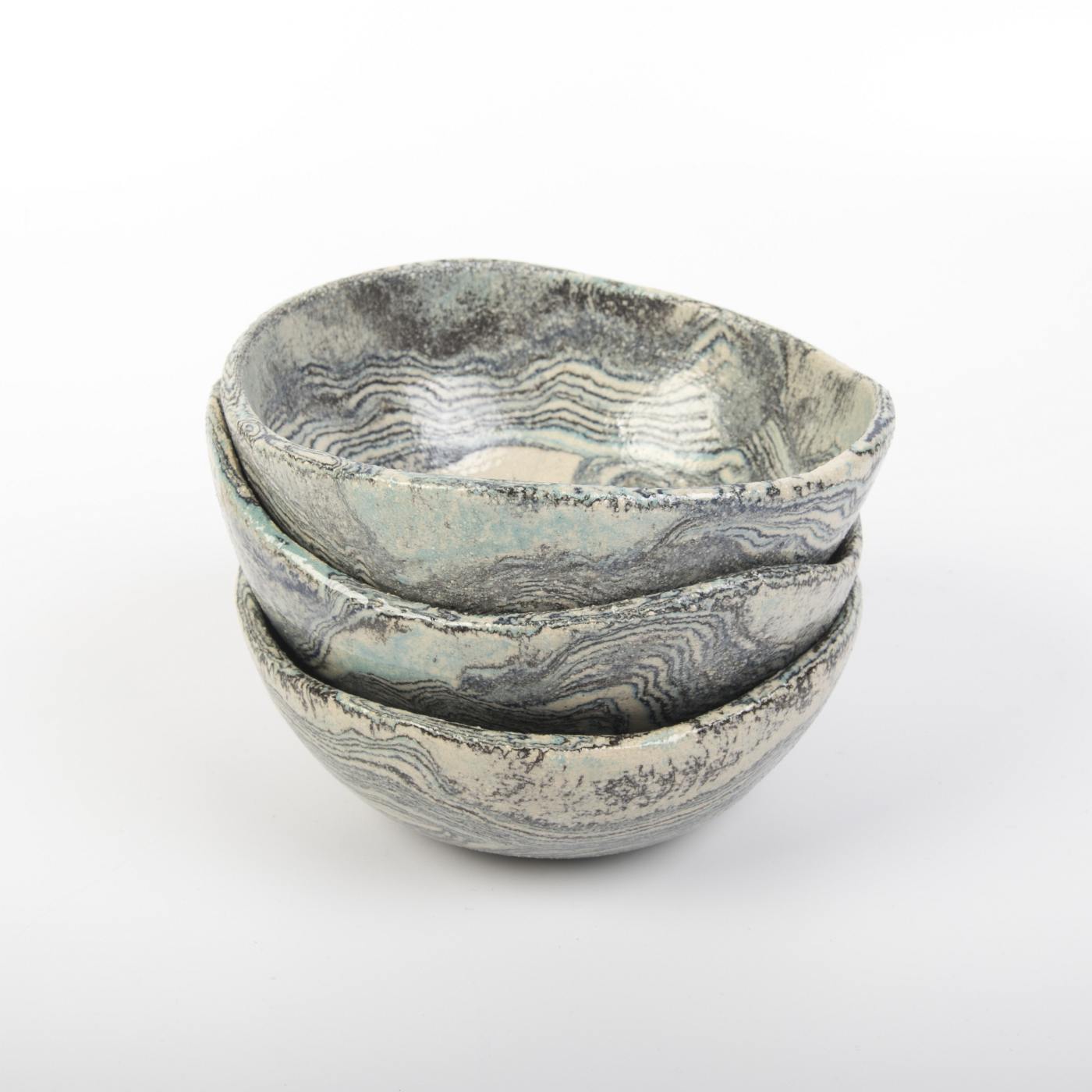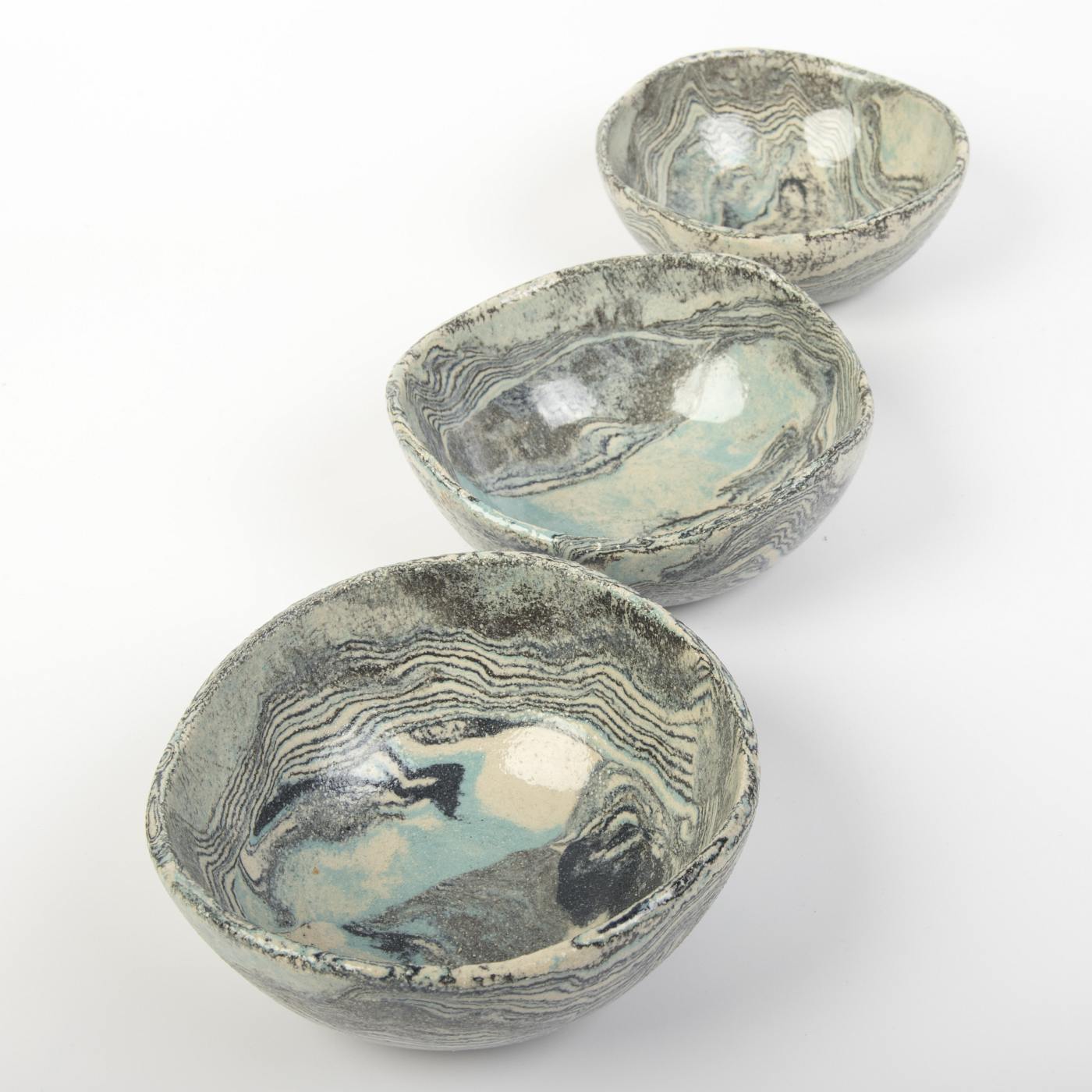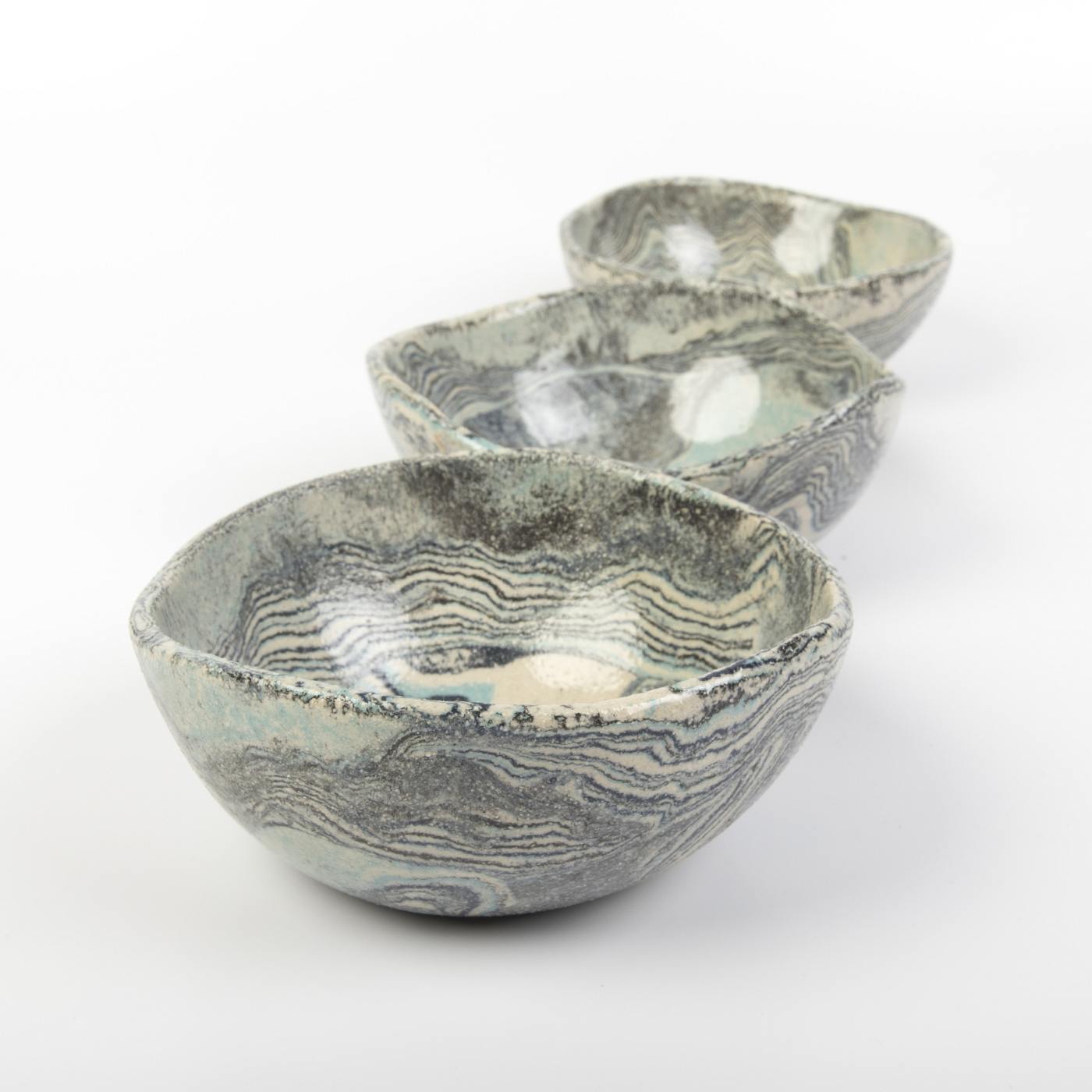 Wyjątkowy zestaw trzech małych miseczek ceramicznych, wykonanych ręcznie z zastosowaniem techniki agatowej (NERIKOMI). Ta precyzyjna metoda tworzenia marmurkowego wzoru sprawia, że każda miseczka jest unikalna, a wzory inspirowane naturą dodają jej artystycznego charakteru.