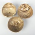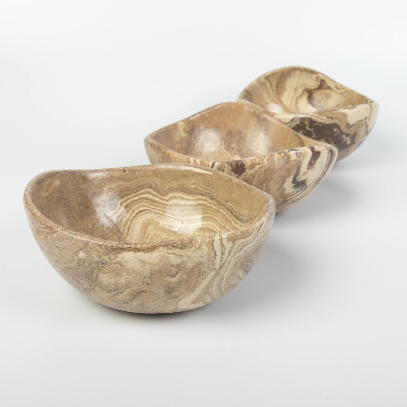 Zestaw trzech ręcznie wykonanych misek ceramicznych z wyjątkowym drewnopodobnym wykończeniem, które harmonijnie łączy naturalną estetykę z funkcjonalnością. Każda miseczka jest jedyna w swoim rodzaju dzięki precyzyjnemu ręcznemu formowaniu i wykończeniu.
