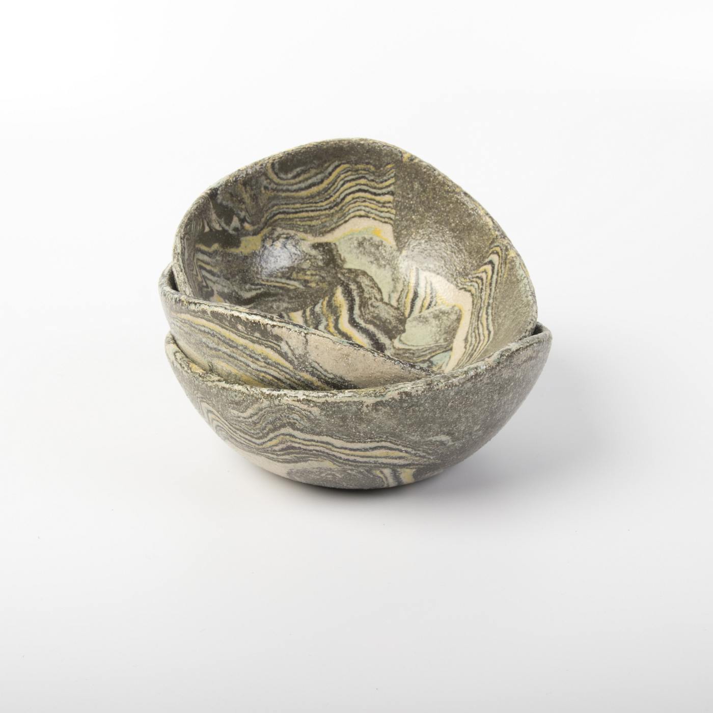 Zestaw trzech ręcznie wykonanych misek ceramicznych w subtelnych odcieniach szarości, zieleni i żółci to idealne połączenie delikatnej kolorystyki i unikalnego designu. Dzięki precyzyjnej pracy rzemieślniczej każda miska wyróżnia się niepowtarzalnym charakterem i wyjątkowym wykończeniem.