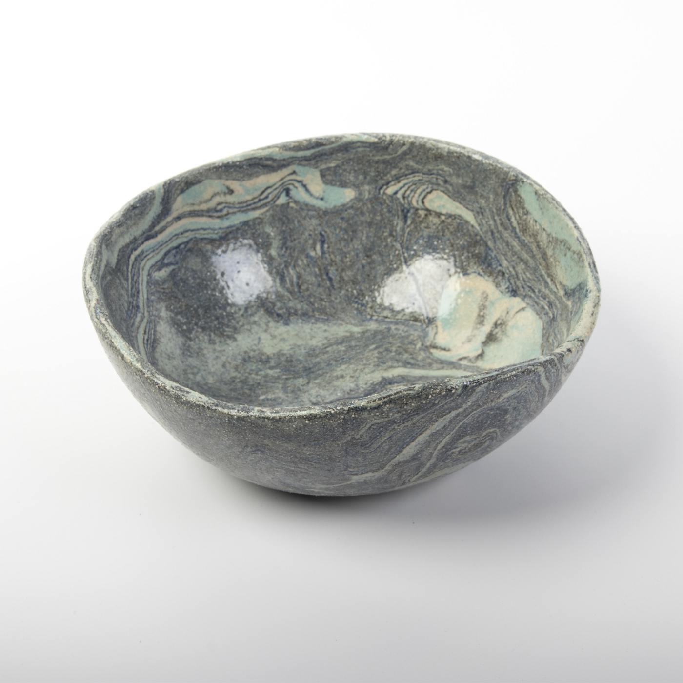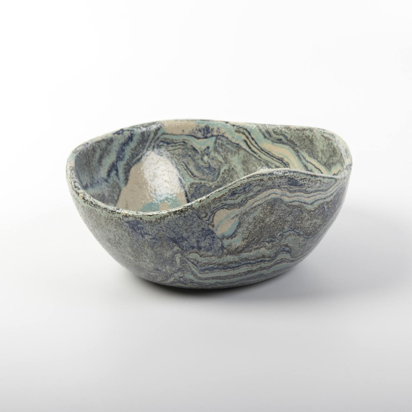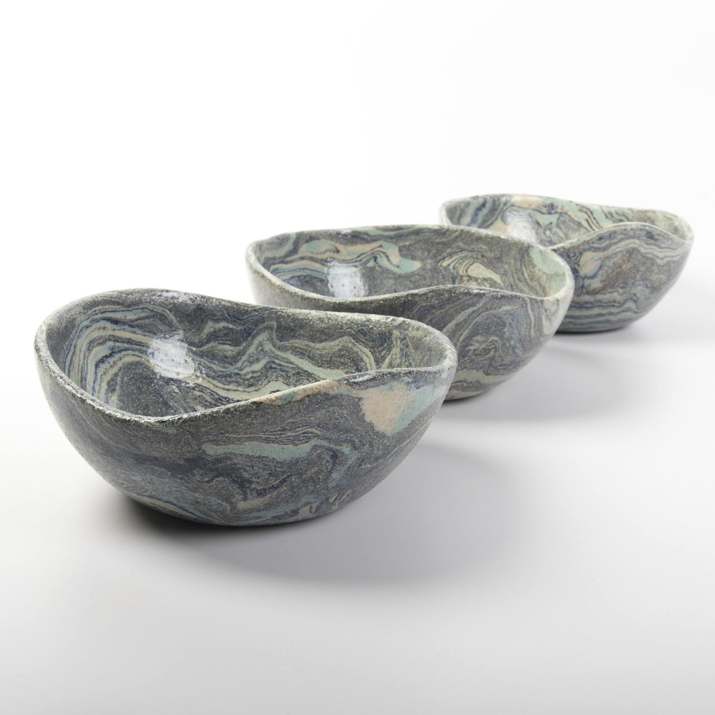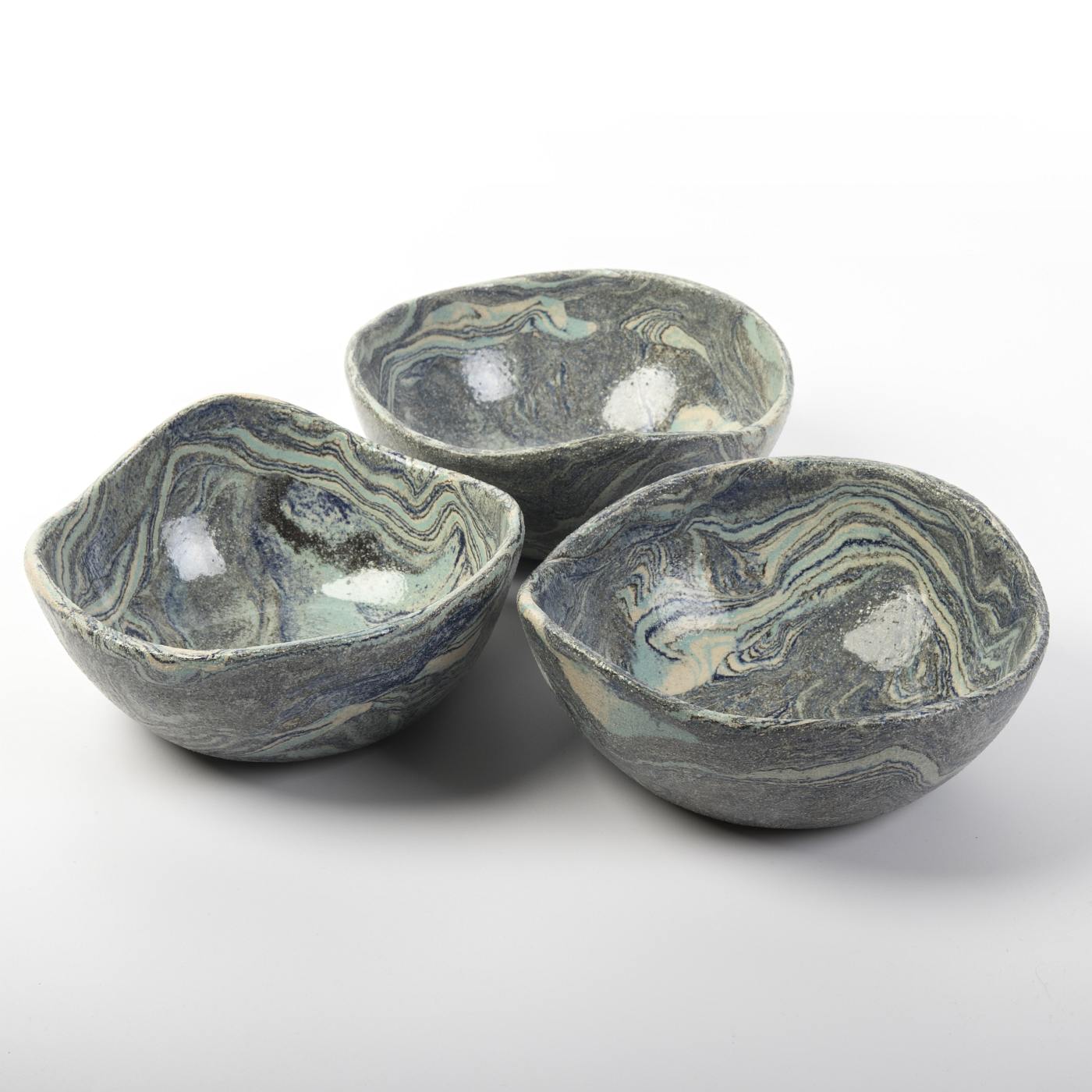 Zestaw trzech ręcznie wykonanych marmurkowych misek ceramicznych w odcieniach niebieskiego i grafitu to wyjątkowy dodatek do Twojej zastawy stołowej. Dzięki technice NERIKOMI, każda miska charakteryzuje się niepowtarzalnym marmurkowym wzorem inspirowanym naturalnymi strukturami kamienia.
