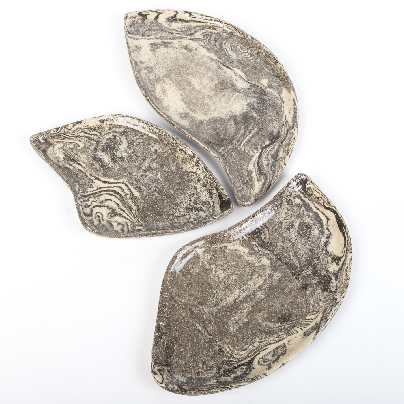 Unikalny zestaw trzech półmisków ceramicznych o nieregularnym kształcie, stworzonych z precyzją i dbałością o detale. Subtelne odcienie szarości i kremu nadają im naturalny, harmonijny wygląd, który doskonale komponuje się z różnorodnymi aranżacjami stołu.