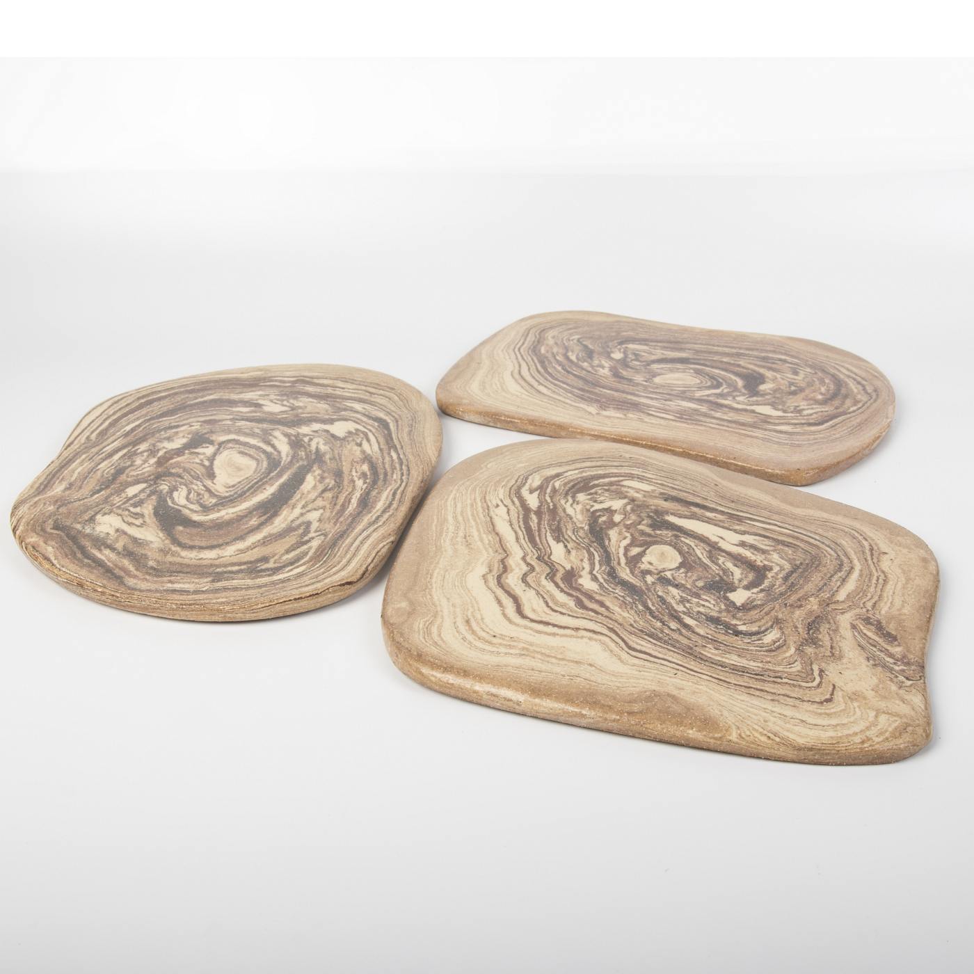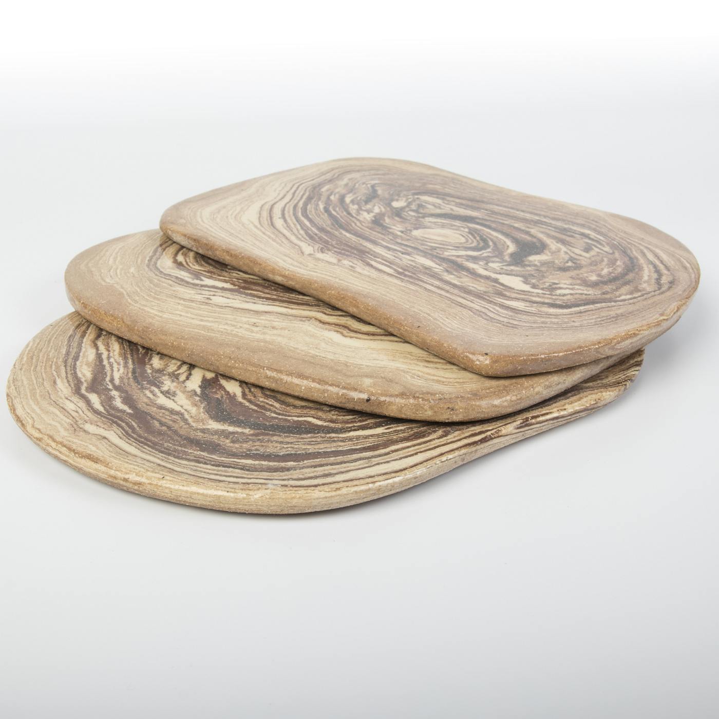 Zestaw trzech ręcznie wykonanych półmisków ceramicznych w kształcie desek, z wykończeniem inspirowanym strukturą drewna, to harmonijne połączenie naturalnej estetyki i praktyczności. Każdy półmisek wyróżnia się subtelnym wzorem drewnopodobnym, który nadaje mu unikalny, organiczny charakter.