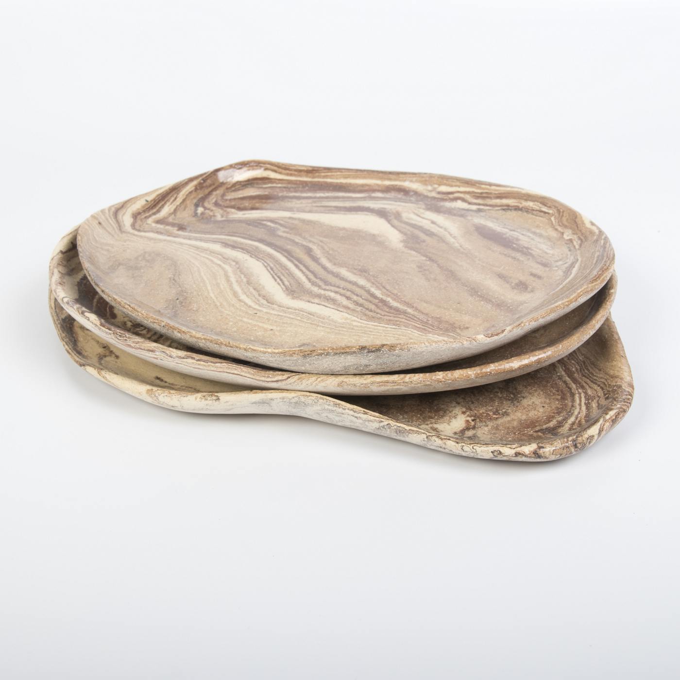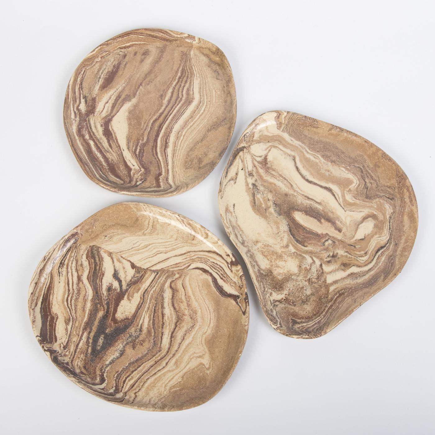 Zestaw trzech ręcznie wykonanych talerzy deserowych o drewnopodobnym wykończeniu to wyjątkowe połączenie naturalnej estetyki i funkcjonalności. Każdy talerz charakteryzuje się unikalnym wzorem inspirowanym strukturą drewna, co podkreśla piękno ręcznego rzemiosła.