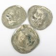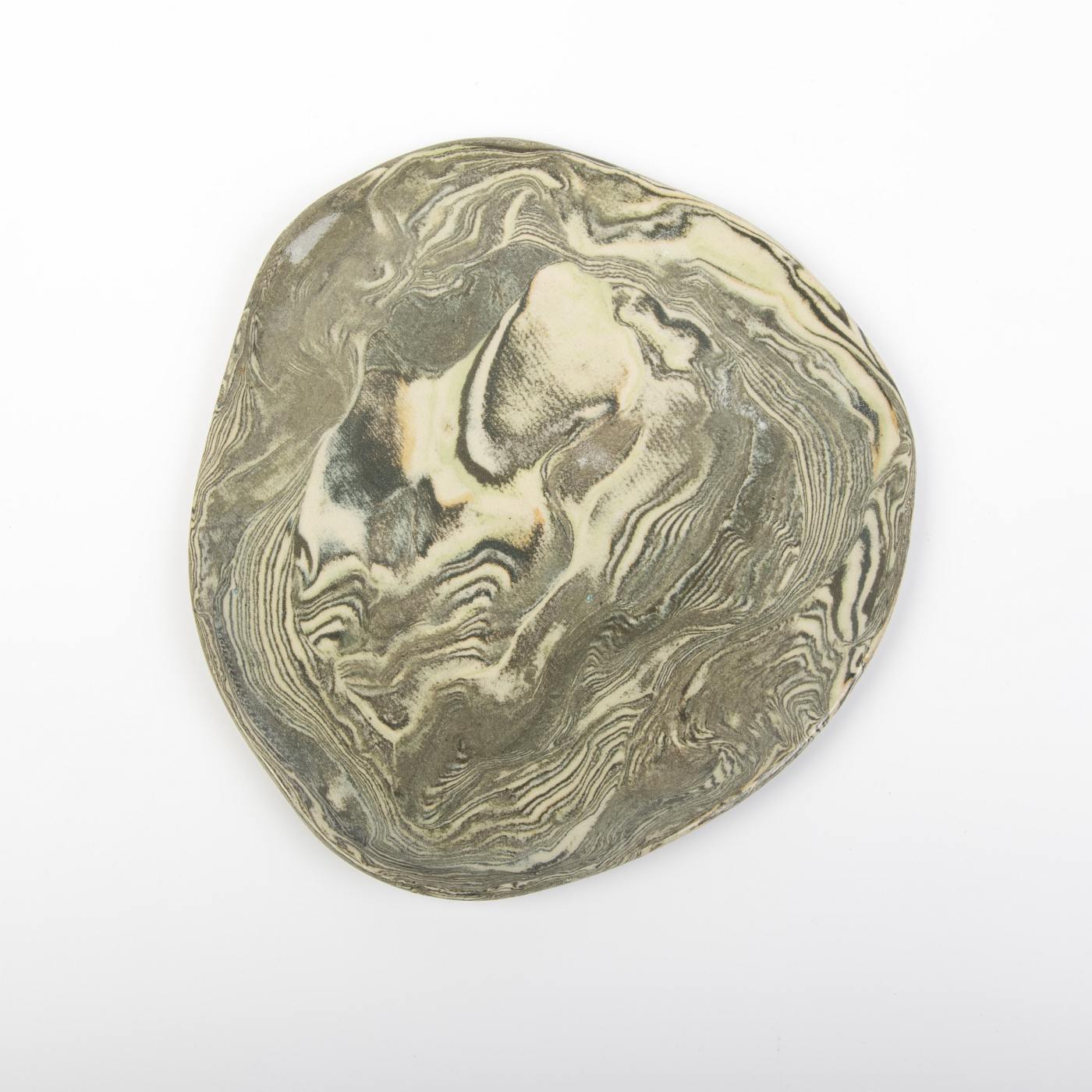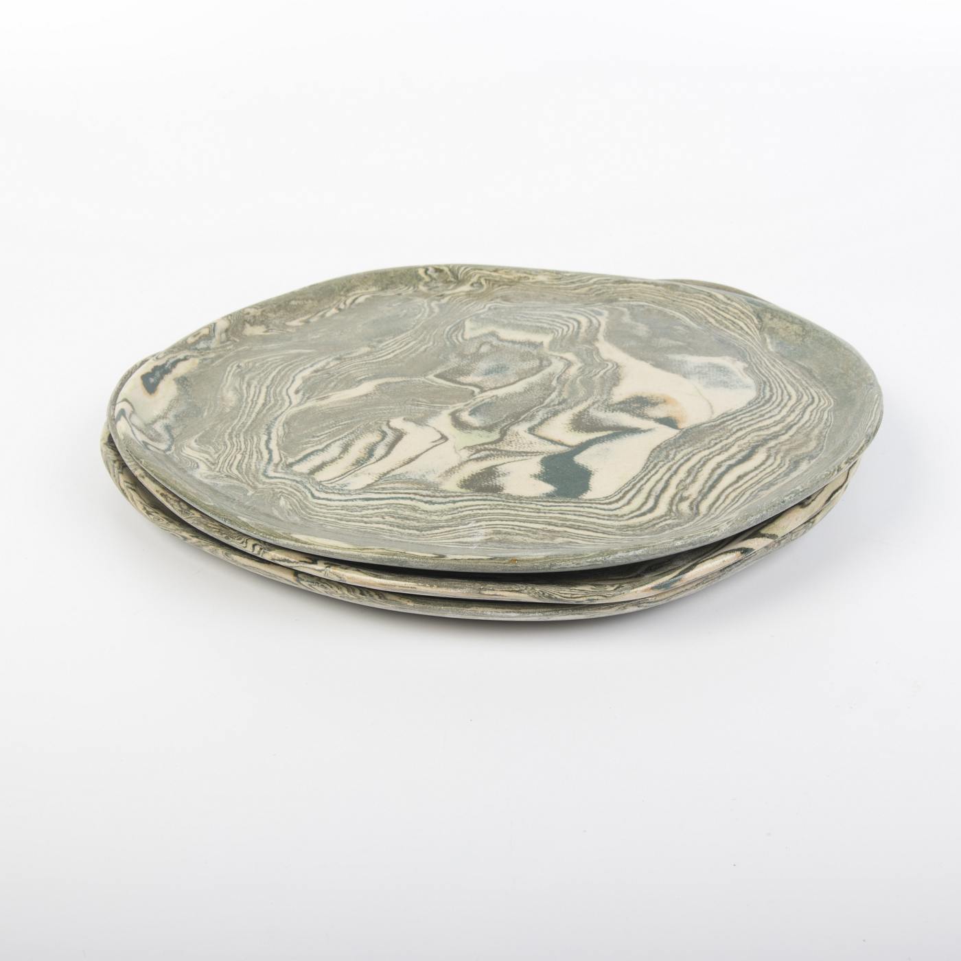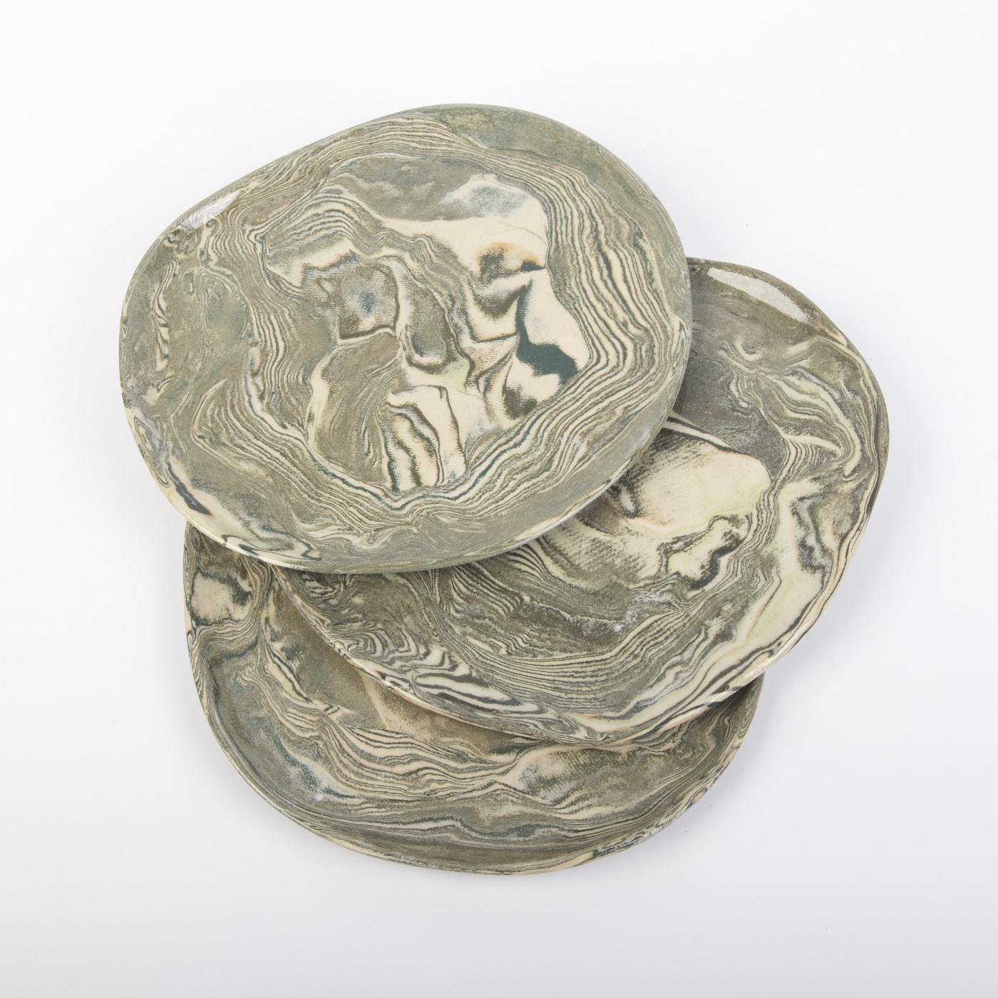Trzy ręcznie wykonane talerze deserowe to prawdziwe dzieła sztuki użytkowej, stworzone techniką agatową, która nadaje im niepowtarzalny wzór i strukturę. Każdy egzemplarz ma unikalny kształt i charakter, co czyni ten komplet wyjątkowym. Talerze wykończono błyszczącą, gładką powierzchnią oraz pokryto transparentnym szkliwem, które jest bezpieczne w kontakcie z żywnością. Inspirowane naturą odcienie zieleni i szarości dodają elegancji i harmonii każdemu wnętrzu.