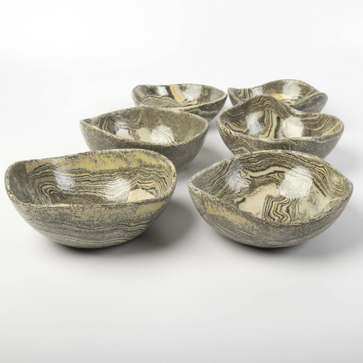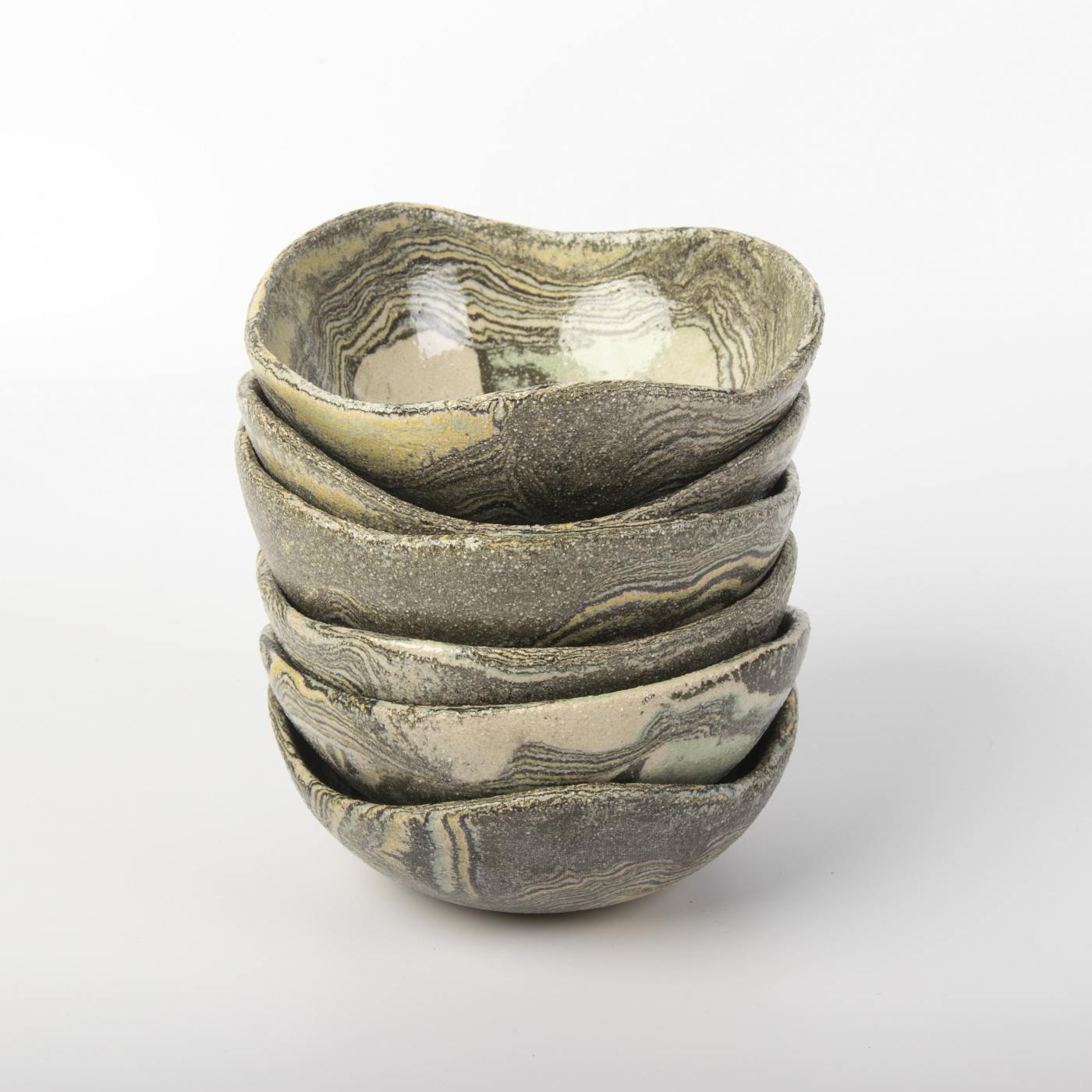 Zestaw sześciu ręcznie wykonanych misek ceramicznych w subtelnych odcieniach szarości, zieleni i żółci to eleganckie połączenie naturalnych barw i mistrzowskiego rzemiosła. Każda miska została wykonana z najwyższą precyzją, co nadaje jej niepowtarzalny charakter.