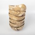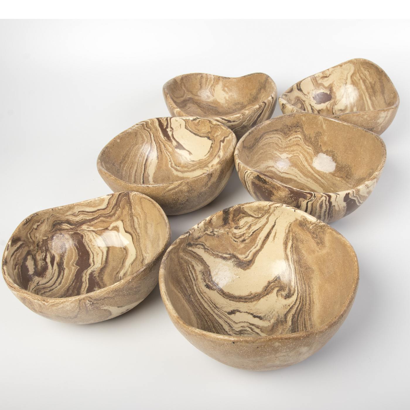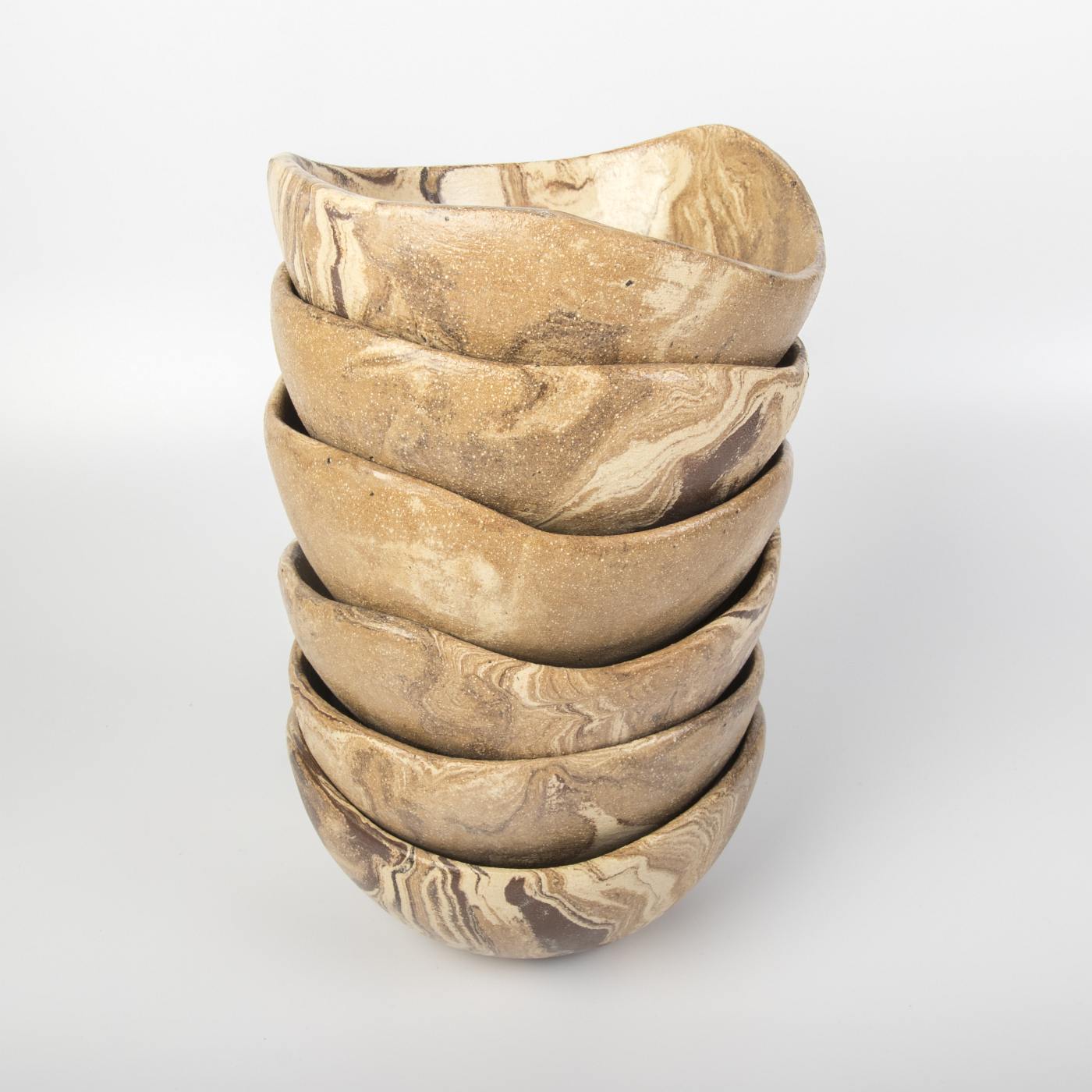 Zestaw sześciu ręcznie wykonanych misek ceramicznych z drewnopodobnym wykończeniem łączy naturalny wygląd drewna z trwałością i funkcjonalnością ceramiki. Każda miska jest precyzyjnie formowana ręcznie, co czyni je jedynymi w swoim rodzaju i dodaje artystycznego charakteru.