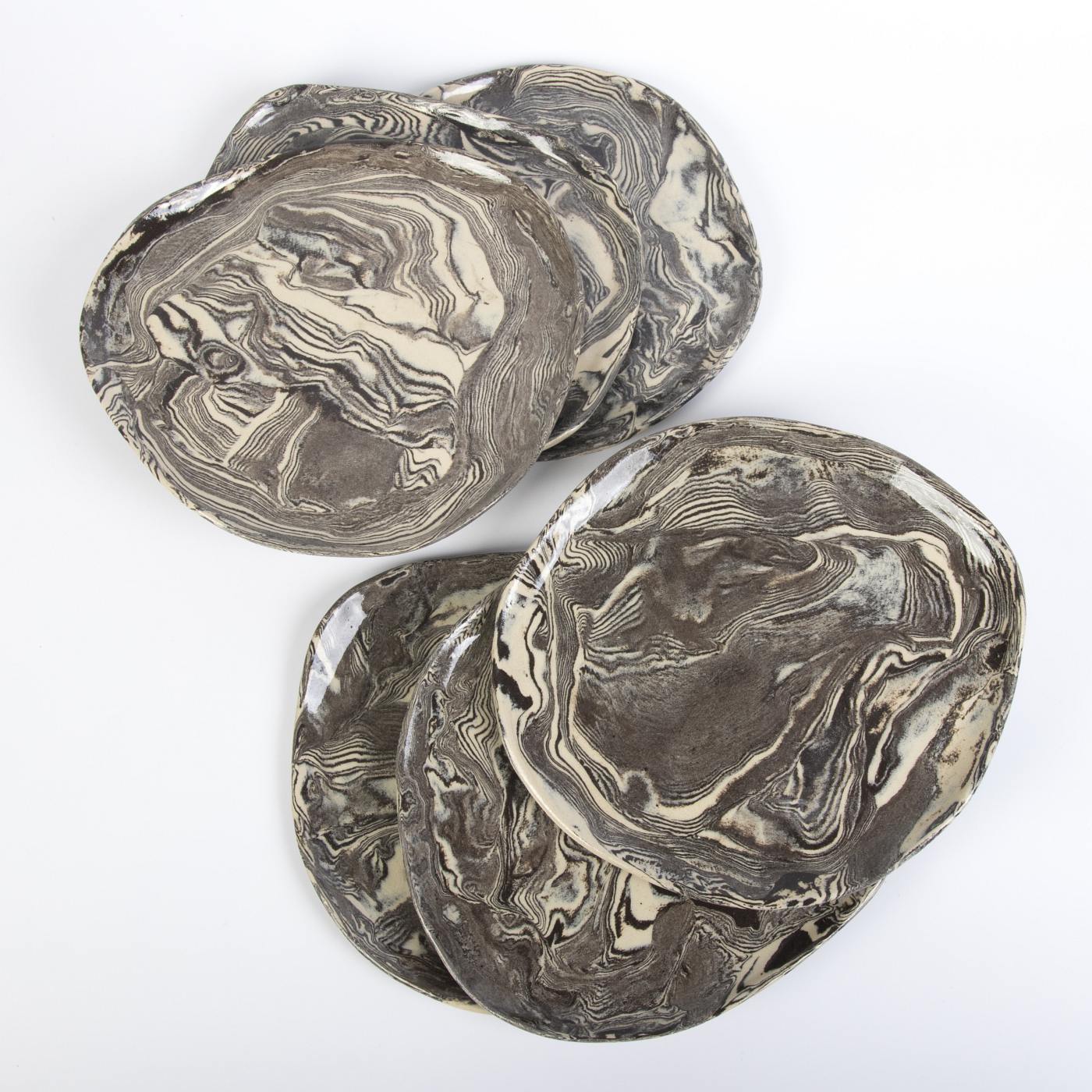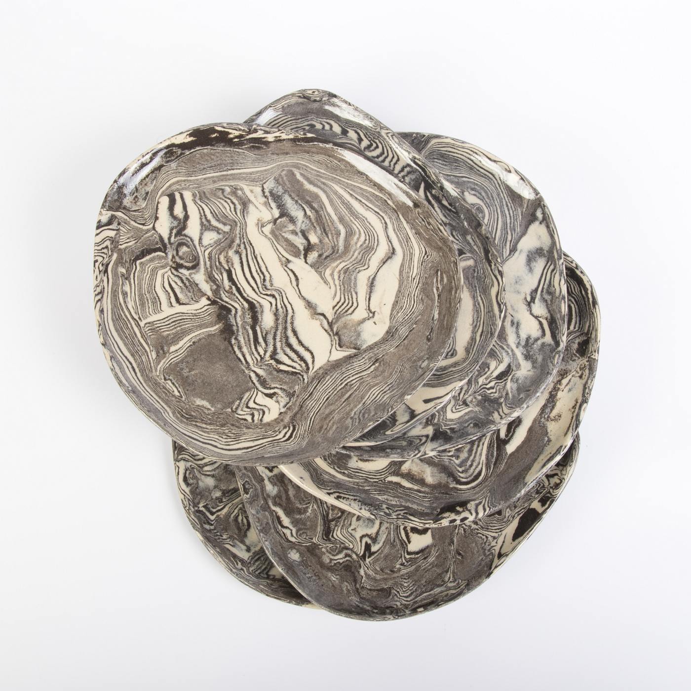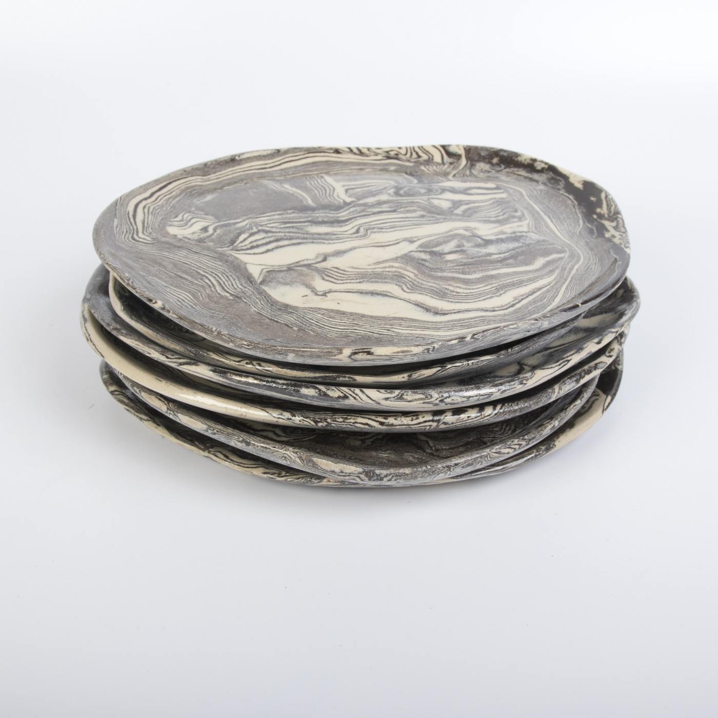 Zestaw sześciu ręcznie wykonanych talerzyków deserowych w wyrafinowanej kolorystyce czarno-kremowej to doskonałe połączenie funkcjonalności i elegancji. Górna powierzchnia talerzyków została pokryta transparentnym szkliwem spożywczym, które nadaje im subtelny połysk oraz wyjątkowo gładką teksturę. Dolna część naczyń jest nieszklona, lecz starannie szlifowana i polerowana, co gwarantuje gładkie i estetyczne wykończenie.