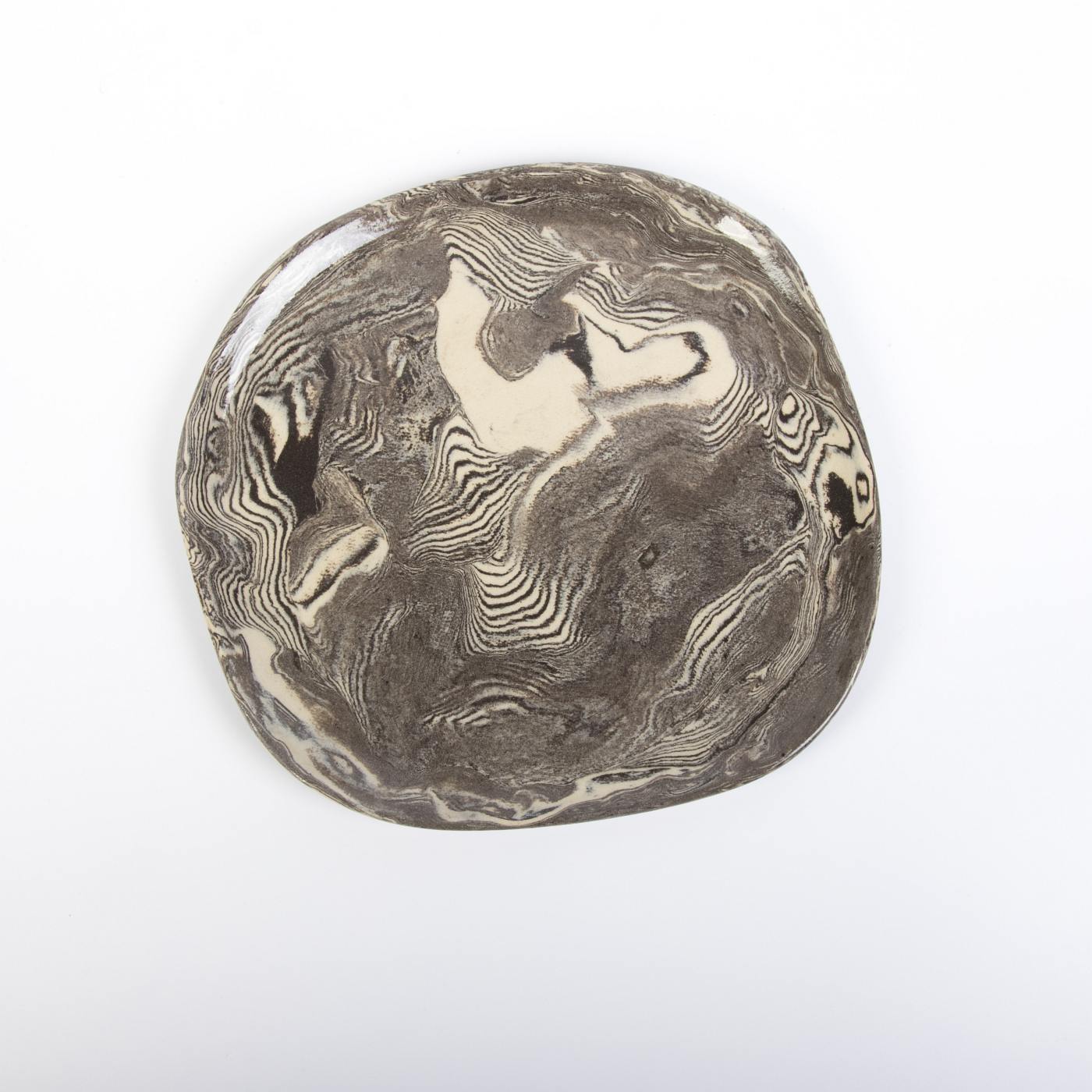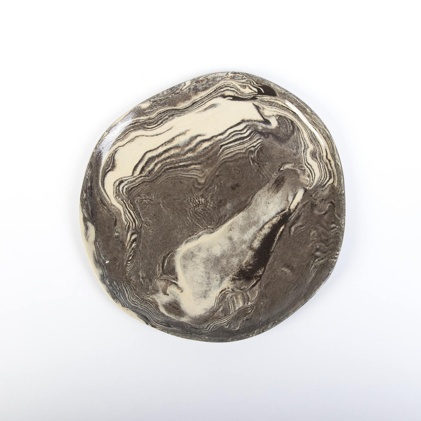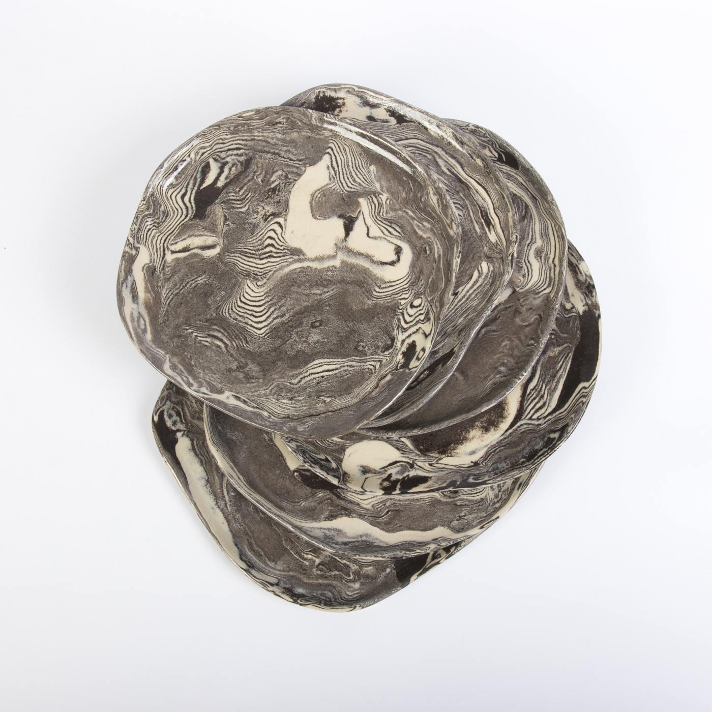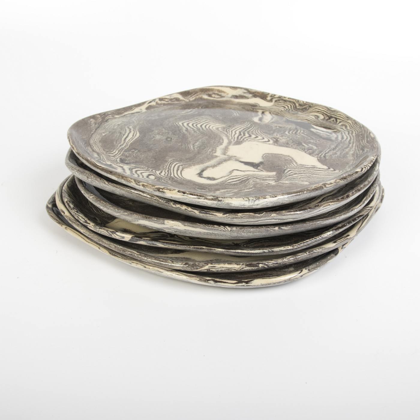 Zestaw sześciu ręcznie wykonanych talerzyków deserowych w eleganckiej kolorystyce czarno-kremowej to połączenie funkcjonalności i artystycznego designu. Górna powierzchnia talerzyków została pokryta transparentnym szkliwem spożywczym, które nadaje im subtelny połysk i wyjątkowo gładką teksturę. Dolna część naczyń jest nieszklona, ale starannie szlifowana i polerowana, co zapewnia gładkie i estetyczne wykończenie.