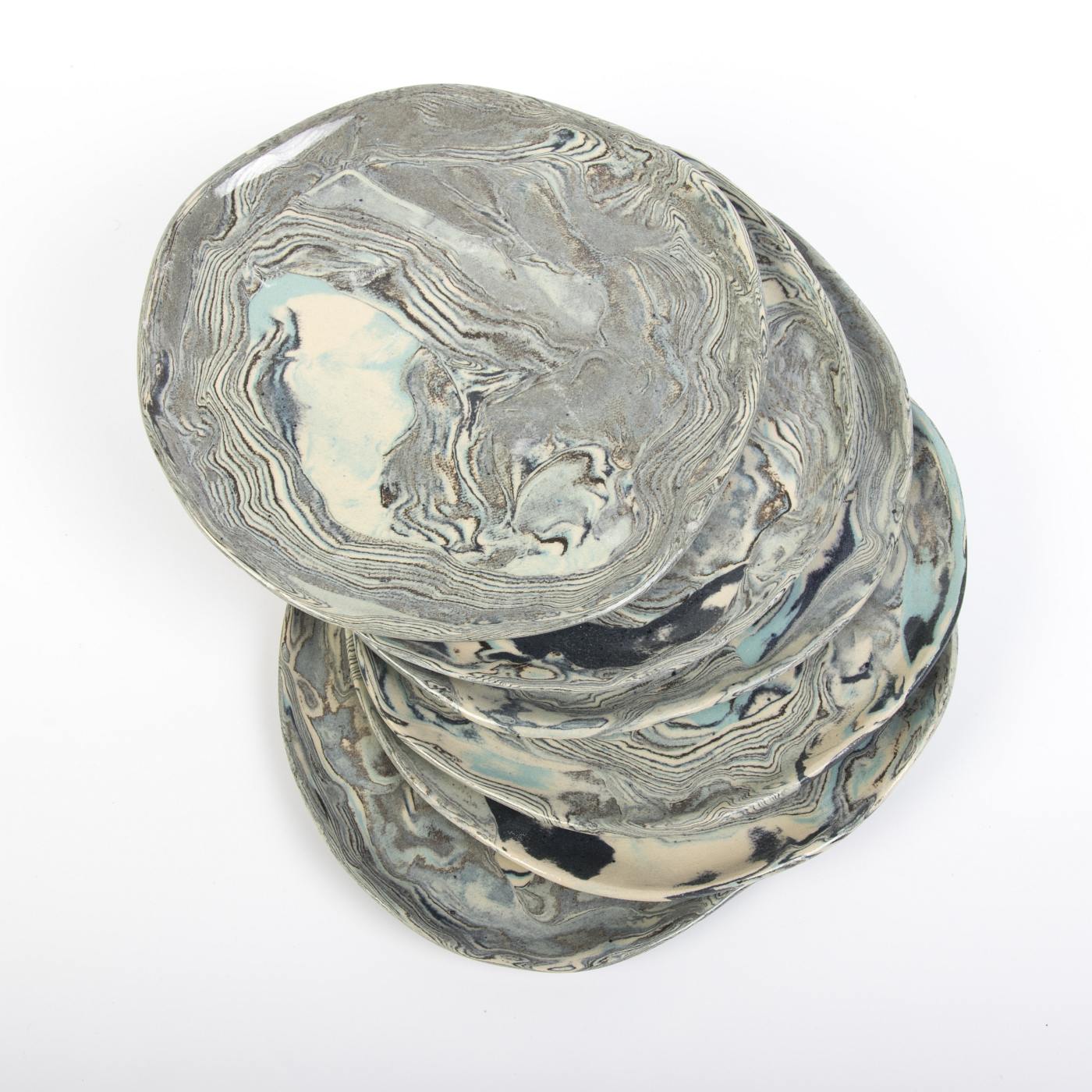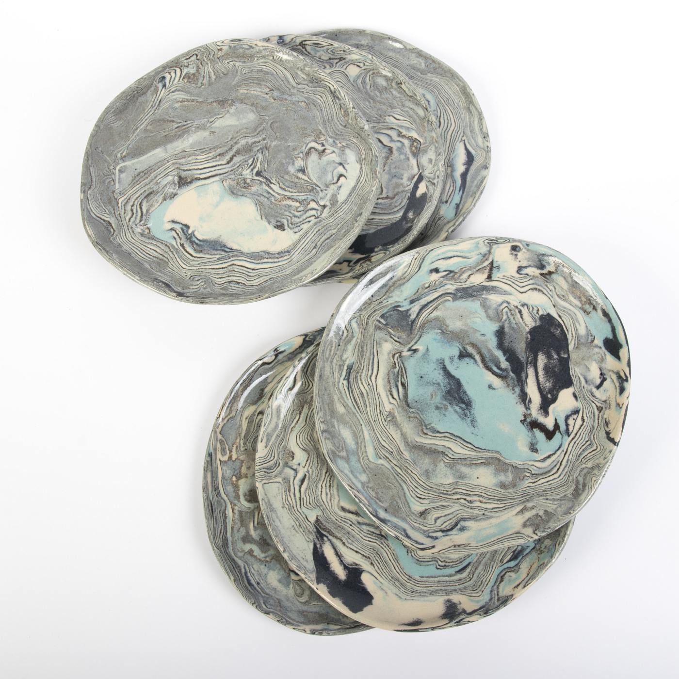 Zestaw sześciu ręcznie wykonanych talerzyków deserowych w eleganckim niebieskim odcieniu to doskonałe połączenie funkcjonalności i wyrafinowanego designu. Górna powierzchnia talerzyków została pokryta transparentnym szkliwem spożywczym, które nadaje im subtelny połysk oraz gładką, przyjemną w dotyku teksturę. Dolna część talerzyków jest nieszklona, ale starannie szlifowana i polerowana, co zapewnia estetyczne i gładkie wykończenie.