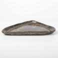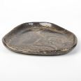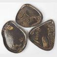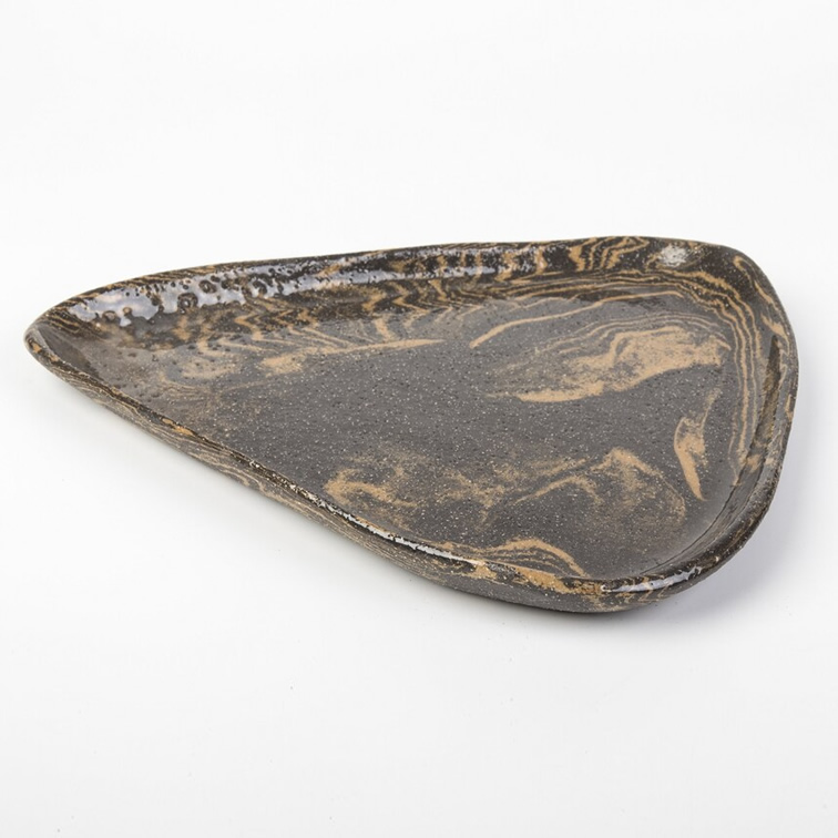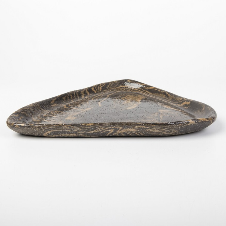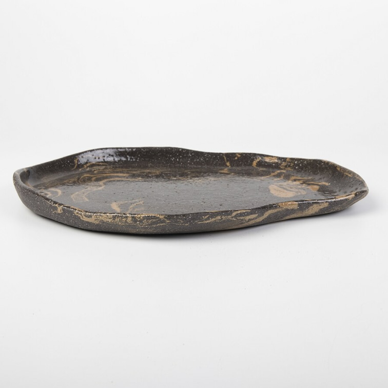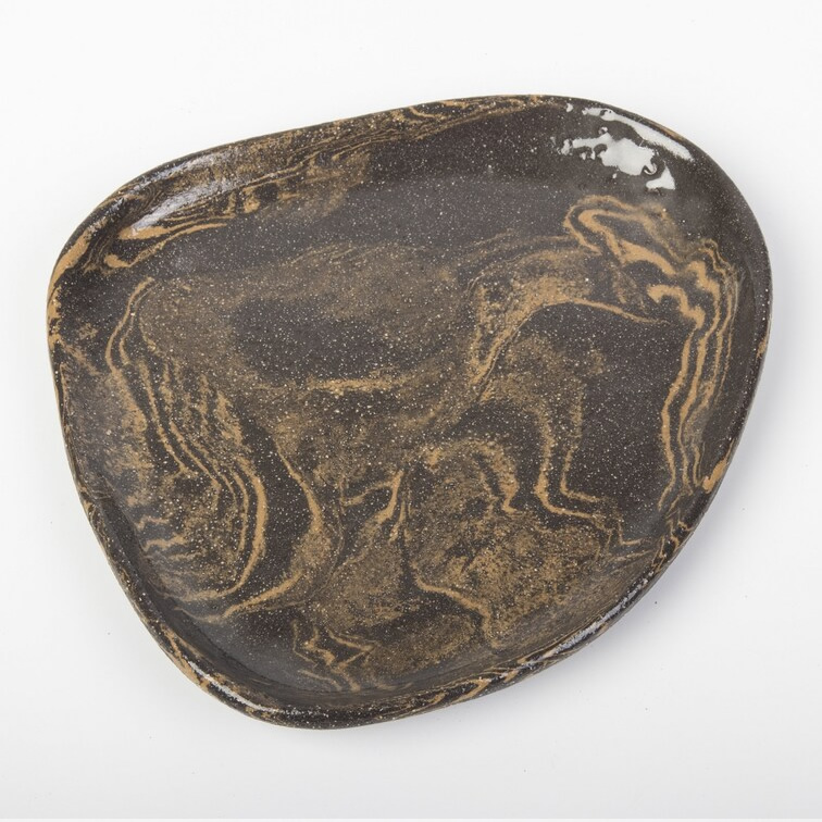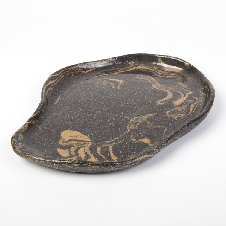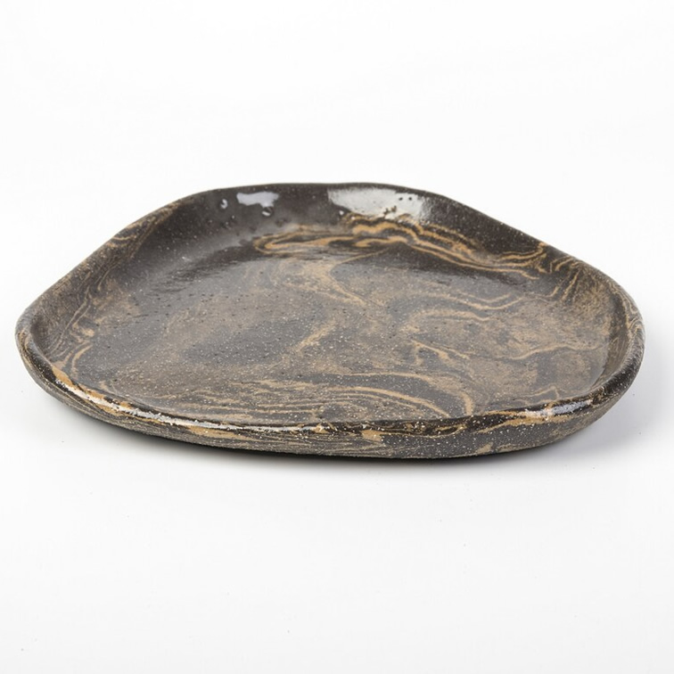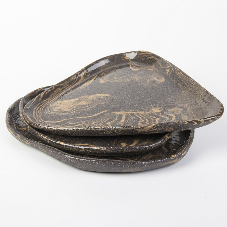 Zestaw trzech talerzy ceramicznych o nieregularnych kształtach, wykonanych techniką NERIKOMI. Odpowiednio zmieszaliśmy czarną, delikatnie nakrapianą glina z pomarańczową - uzyskując niepowtarzalne wzory marmurkowe.