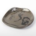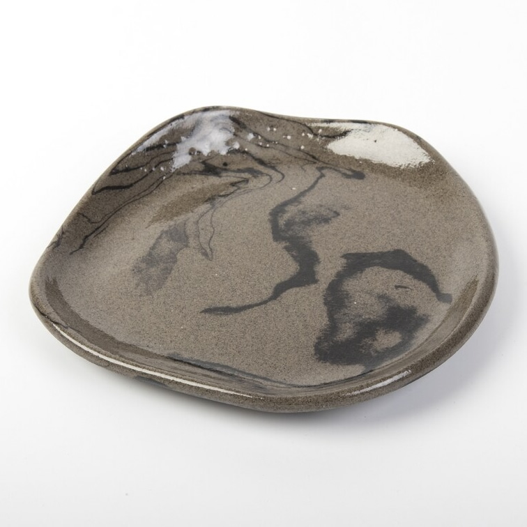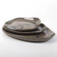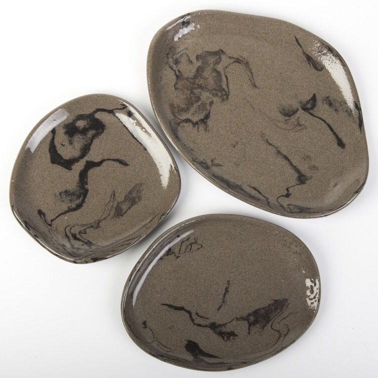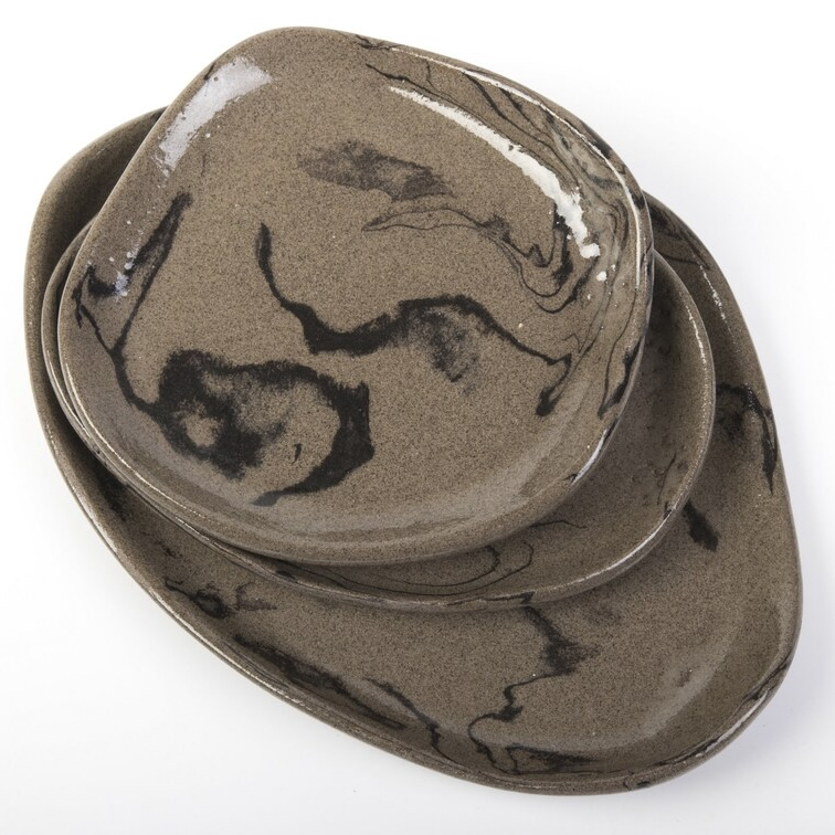 Zestaw trzech różnych wielkości talerzy ceramicznych wykonanych techniką NERIKOMI. Brązowa glina została odpowiednio zmieszana z niewielką ilością czarnej - uzyskaliśmy w ten sposób fekt marmurku.
